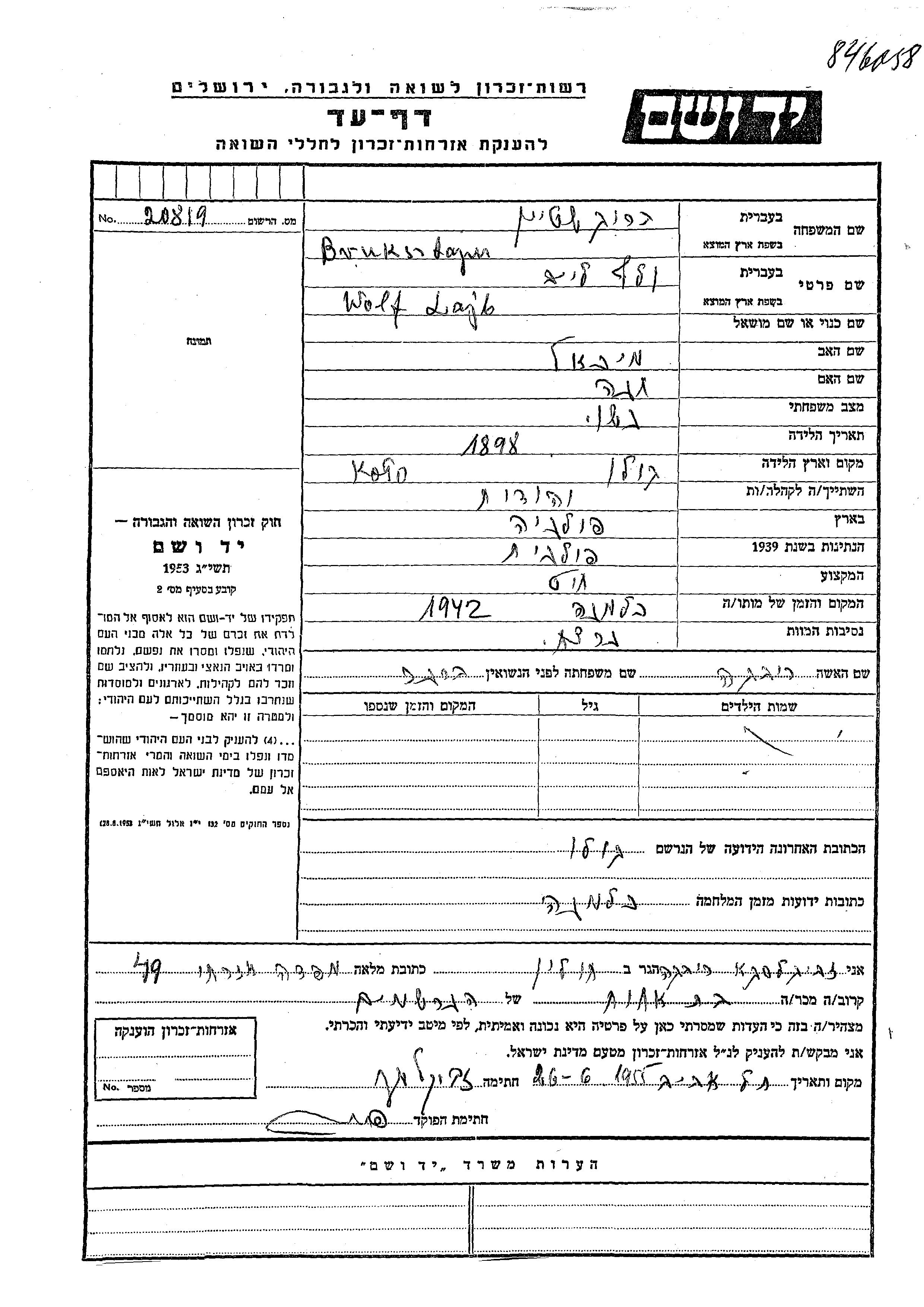 Wolf Laib Bruksztajn נולד בKolo שבפולין בשנת 1898 למיכאל וחנה. הוא היה חייט ונשוי לרבקה לבית ברבר. לפני מלחמת העולם השניה התגורר בKolo שבפולין. בזמן המלחמה הוא היה בKolo שבפולין. הוא נרצח בשואה. מקום המוות: Chelmno שבפולין בשנת 1942.