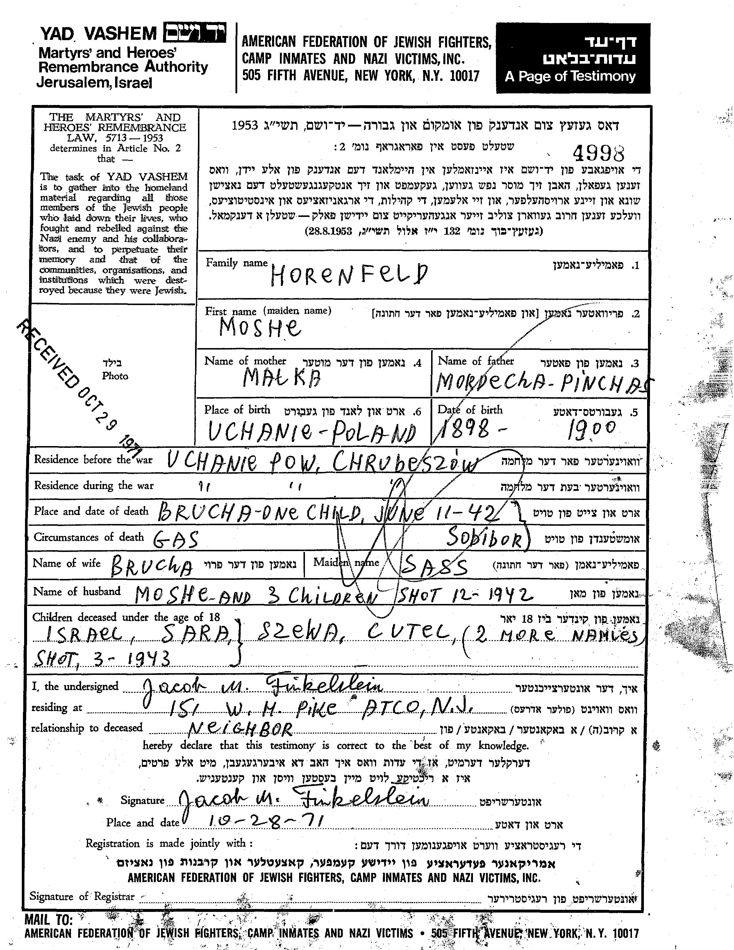 משה Horenfeld נולד בשנת 1898. לפני מלחמת העולם השניה התגורר בUchanie שבפולין.