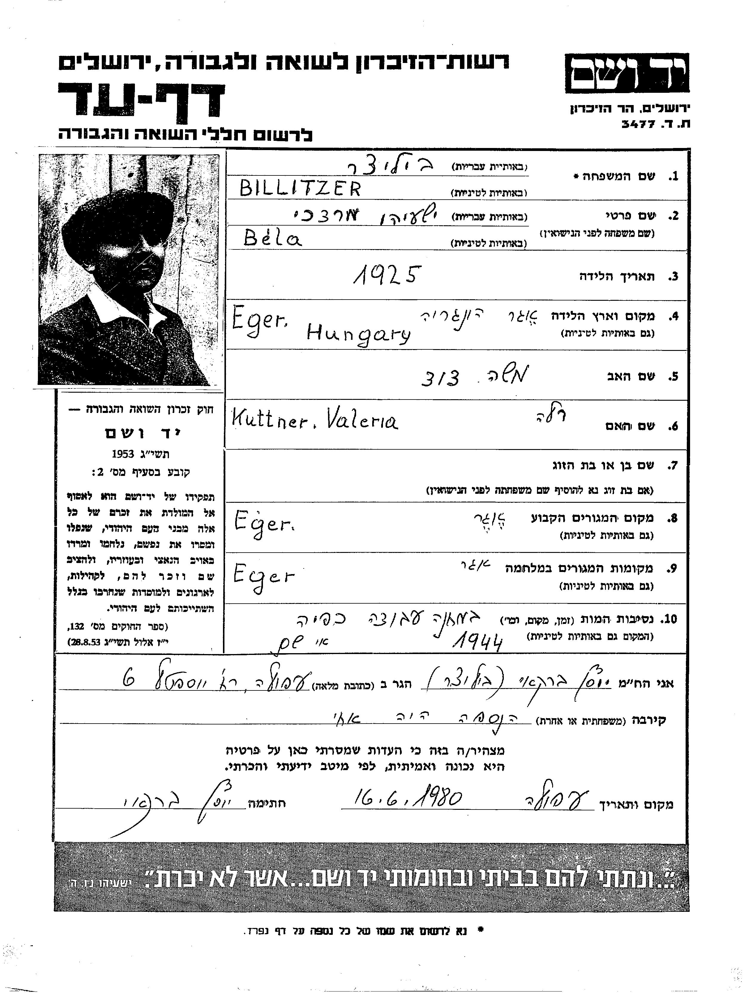 | Billitzer | בלה ישעיהו מרדכי | 1925 | Eger, | Photos |