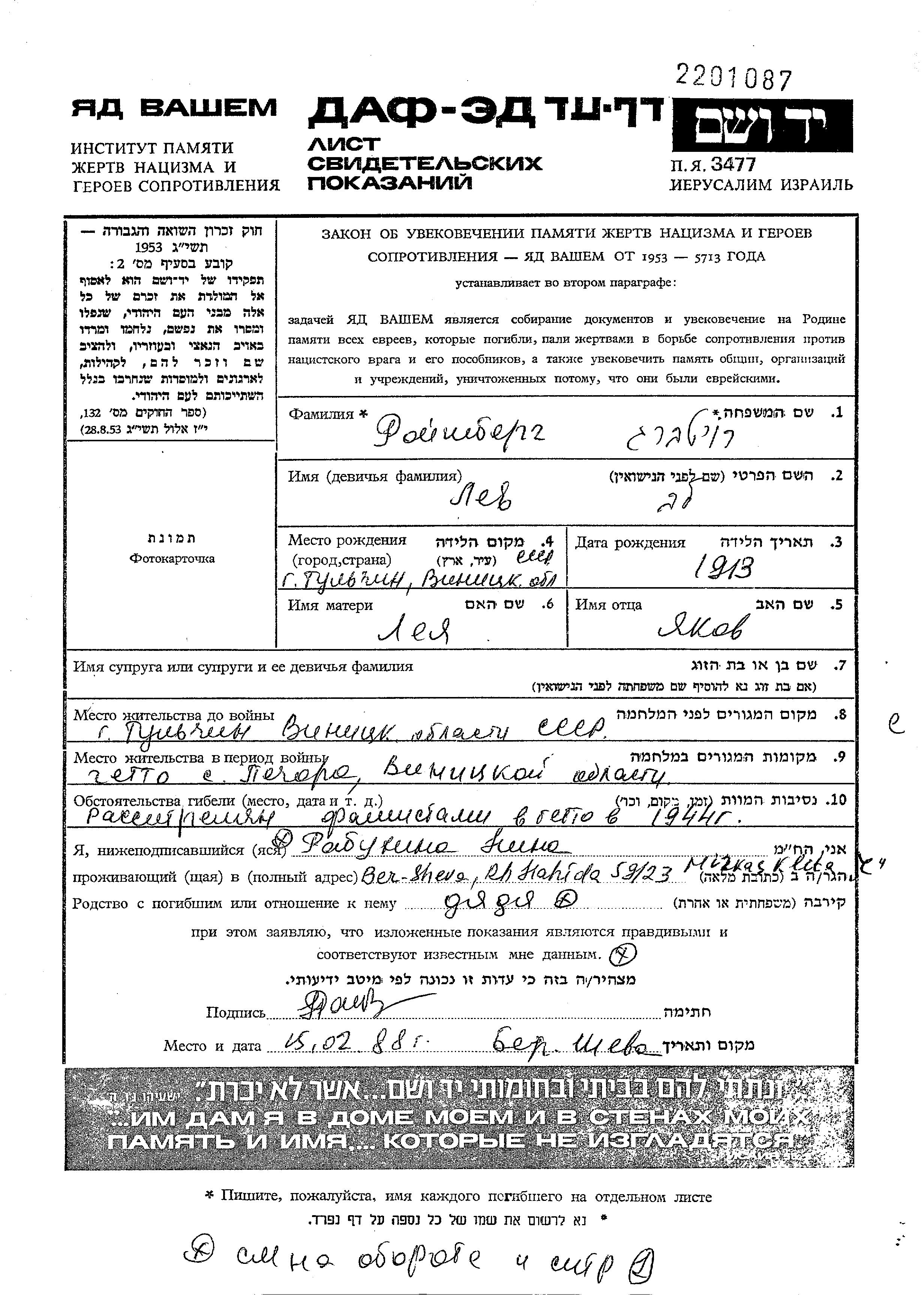 לב נרצח בשואה. מקום המוות: Pechera שבאוקראינה (ברה"מ) בשנת 1944.