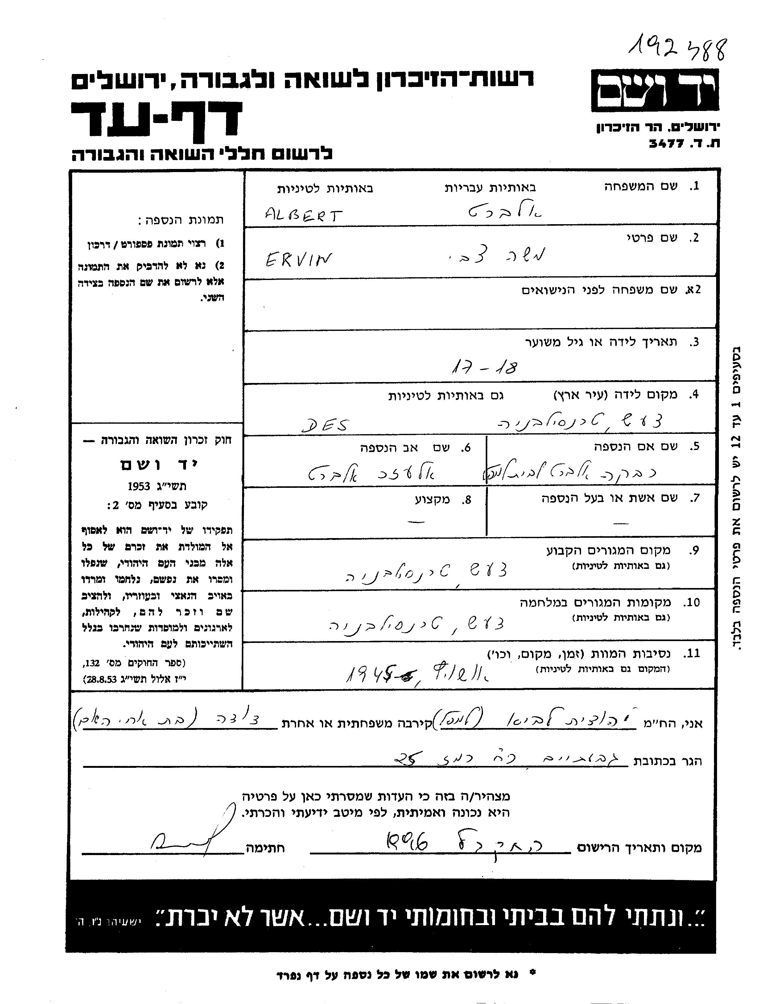 אלברט משה צבי ארווין 1925 Des, רומניה דף-עד