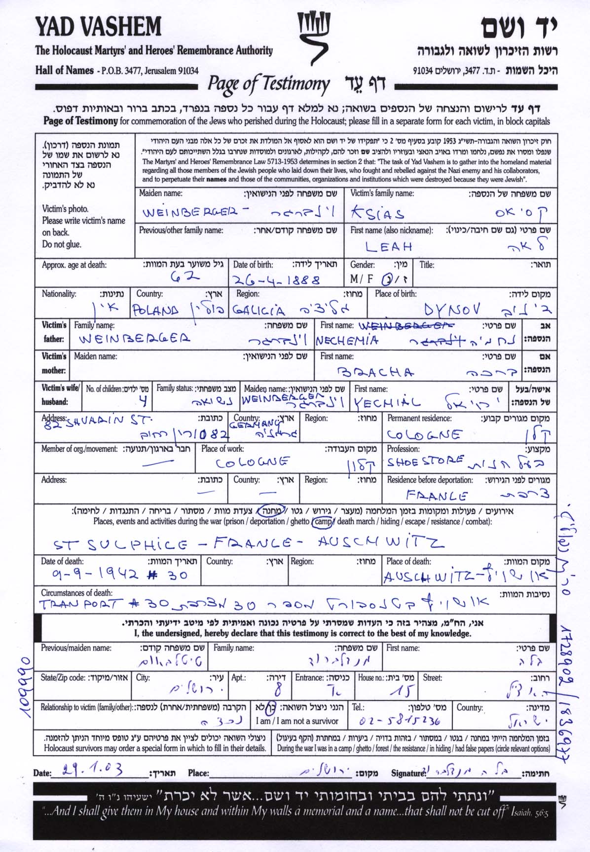 לאה נרצחה בשואה. מקום המוות: Auschwitz שבפולין בשנת 09/09/1942.