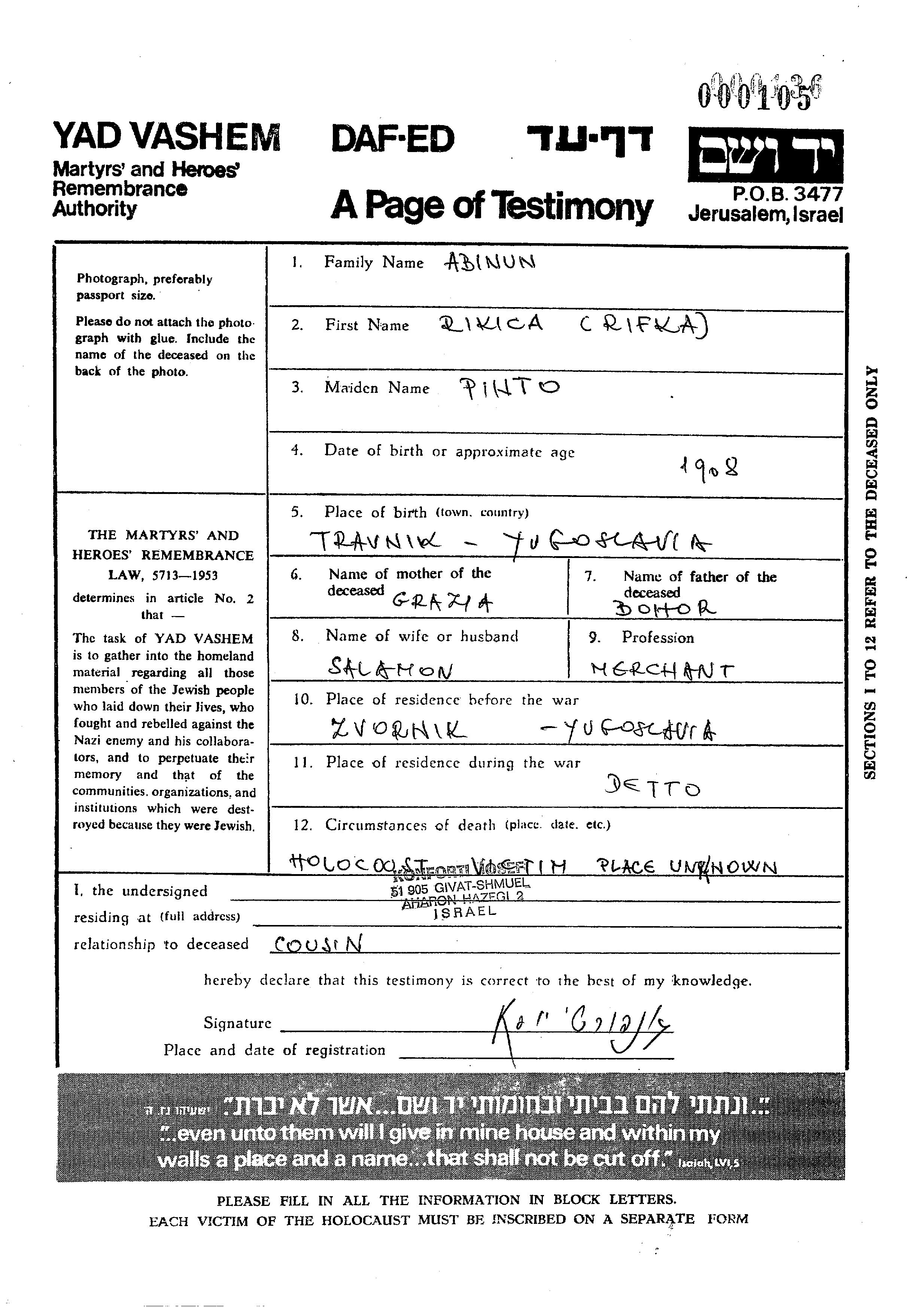 Rikica רבקה אבינון לבית פינטו נולדה בTravnik שביוגוסלביה בשנת 1908. היא היתה סוחרת. לפני מלחמת העולם השניה התגוררה בZvornik שביוגוסלביה.
