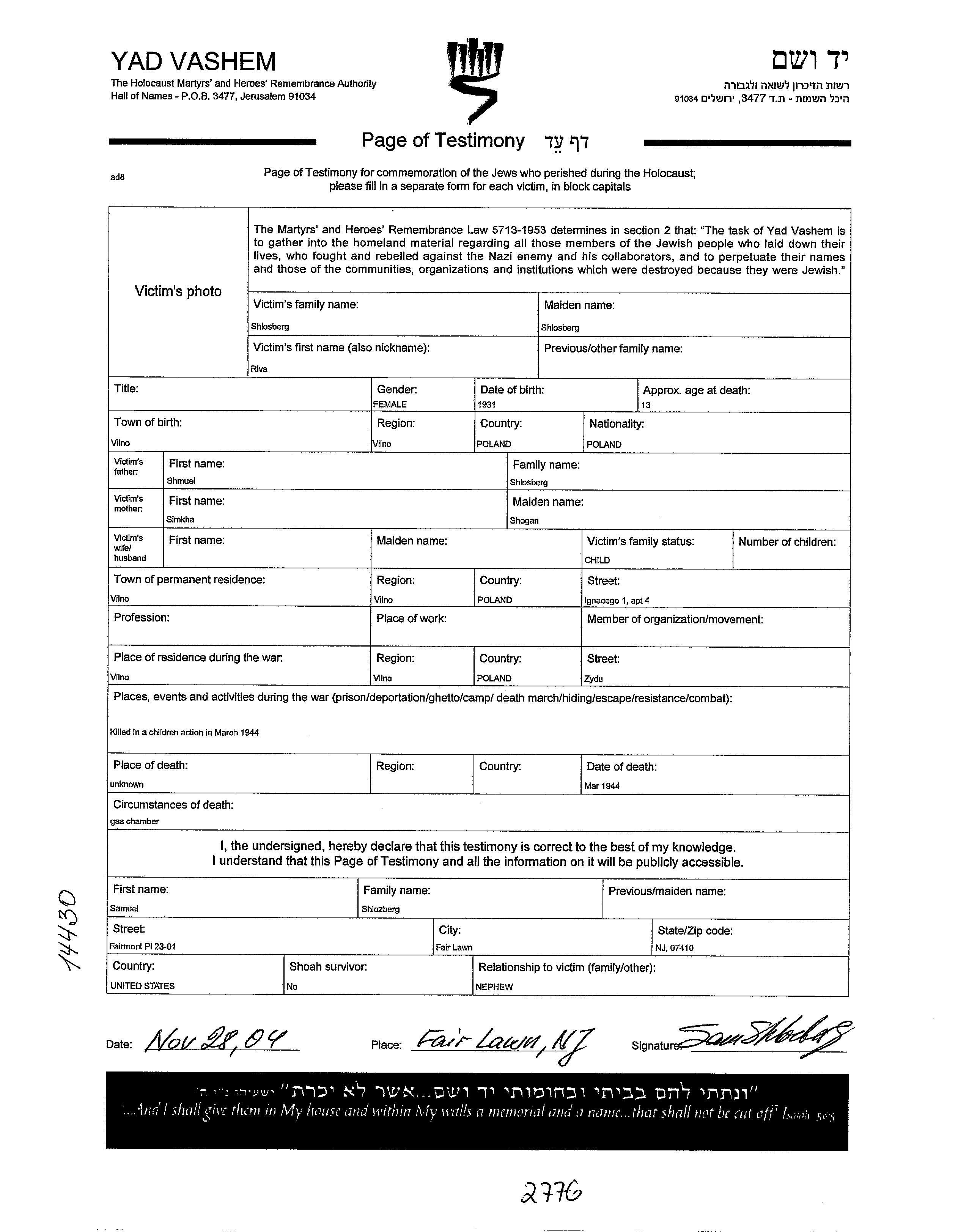 שלוסברג רבקה 1931 Wilno, פולין דף-עד