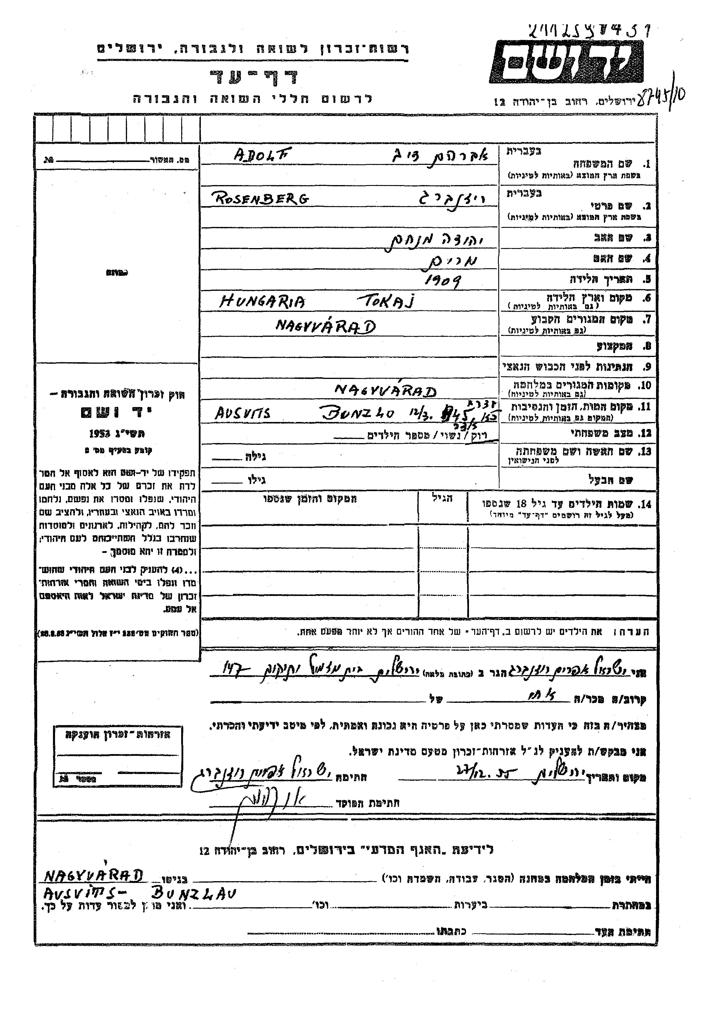 אברהם דוב אדולף Rosenberg נולד בTokaj שבהונגריה בשנת 1909. לפני מלחמת העולם השניה התגורר בNagyvarad שברומניה.