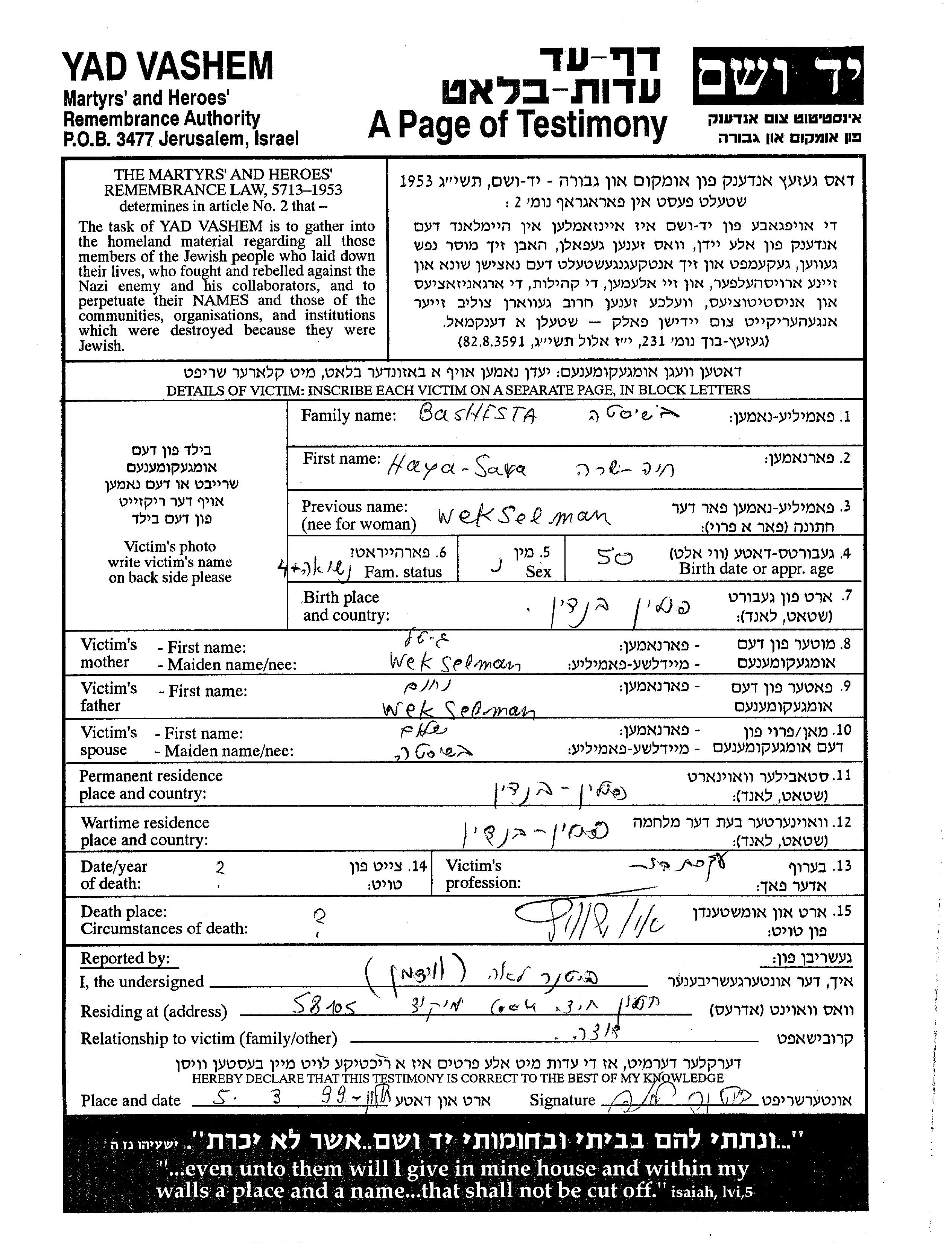 חיה שרה Baszista לבית Wekselman נולדה בשנת 1904. היא היתה עקרת בית. לפני מלחמת העולם השניה התגוררה בBendzin שבפולין.