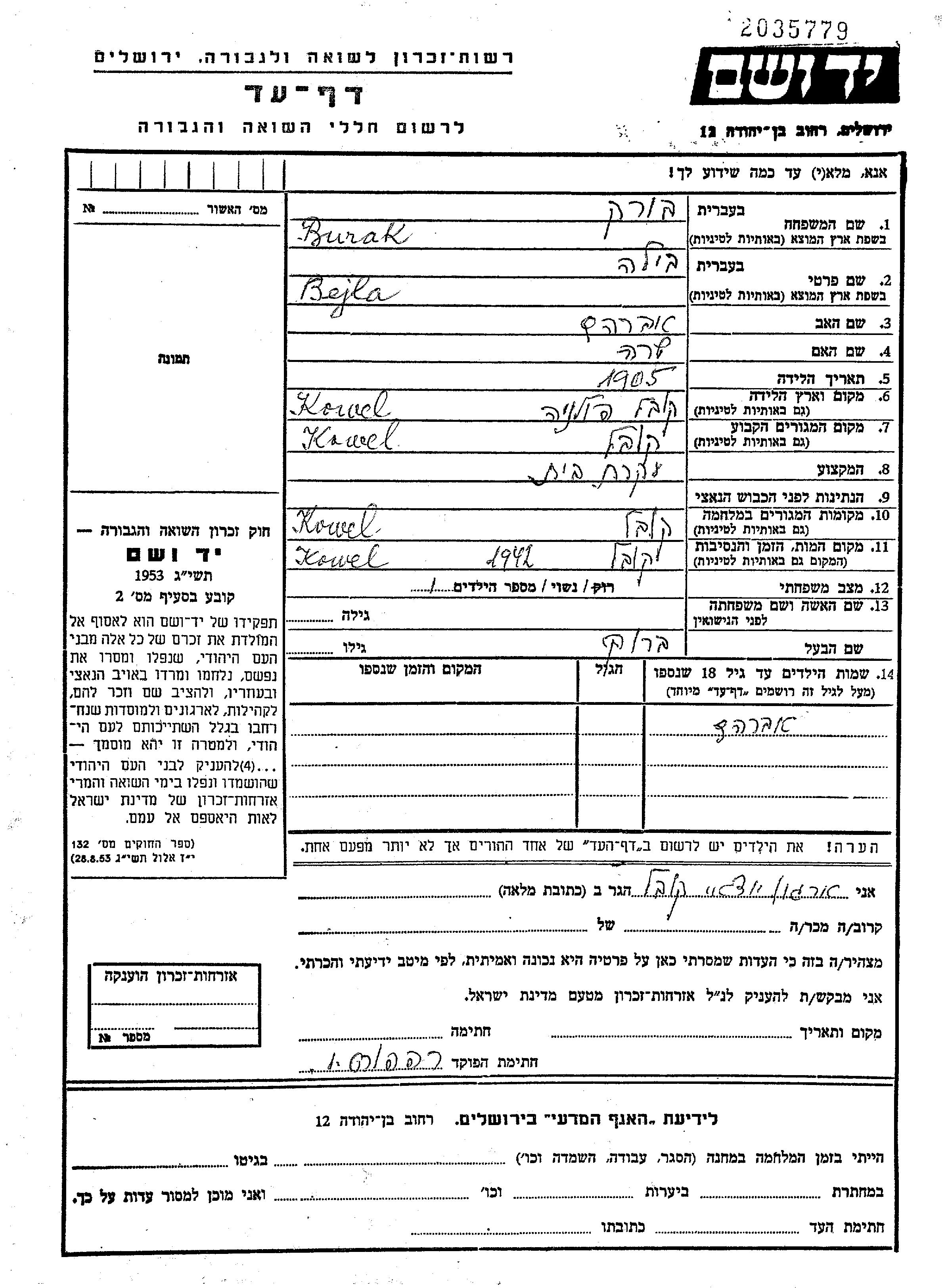 בורק Bejla 1905 Kowel, פולין דף-עד