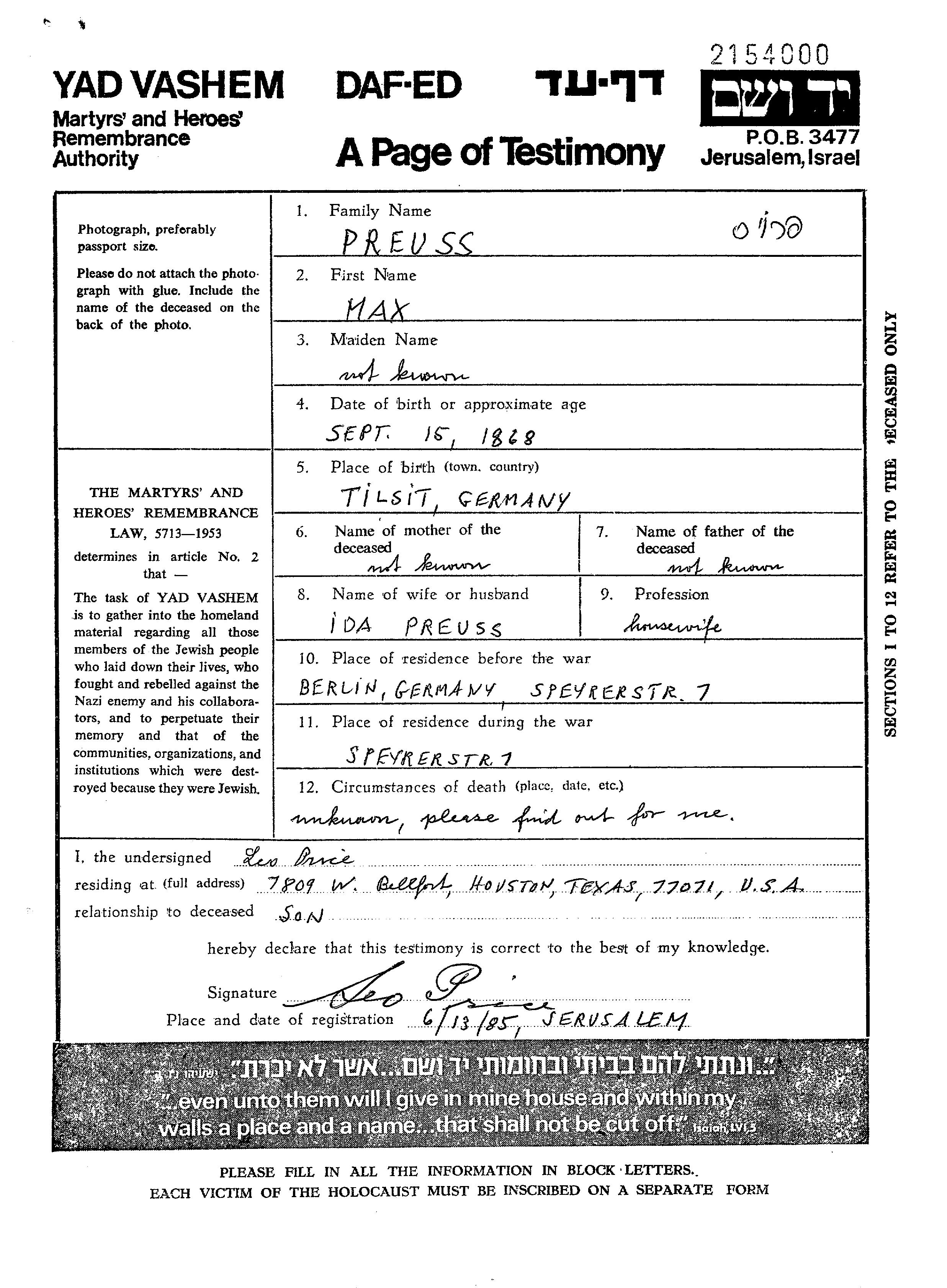 מקס נרצח בשואה. מקום המוות: מקום לא רשום.
