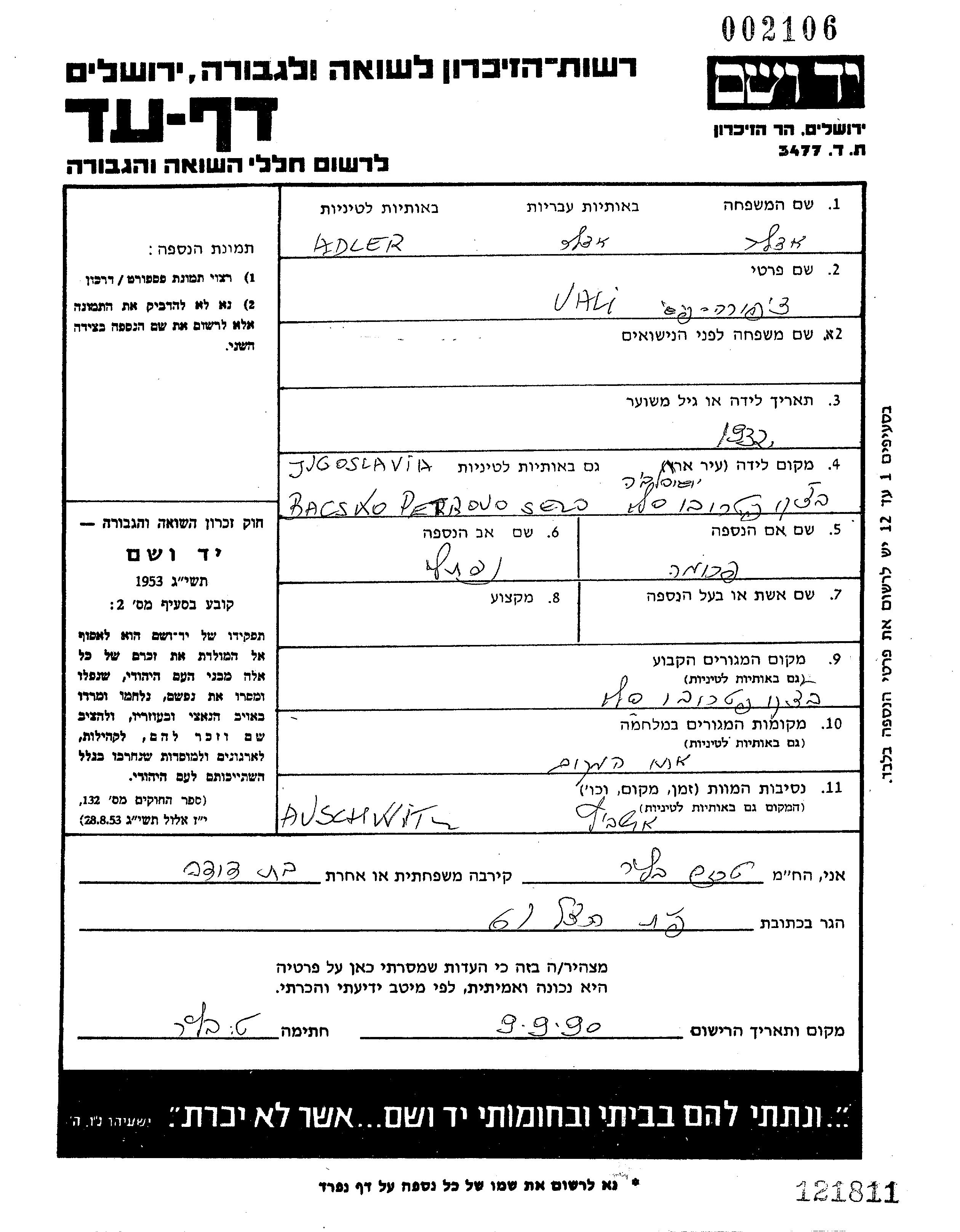 אדלר צפורה ולריה 1932 Backo Petrovo Selo, יוגוסלביה דף-עד