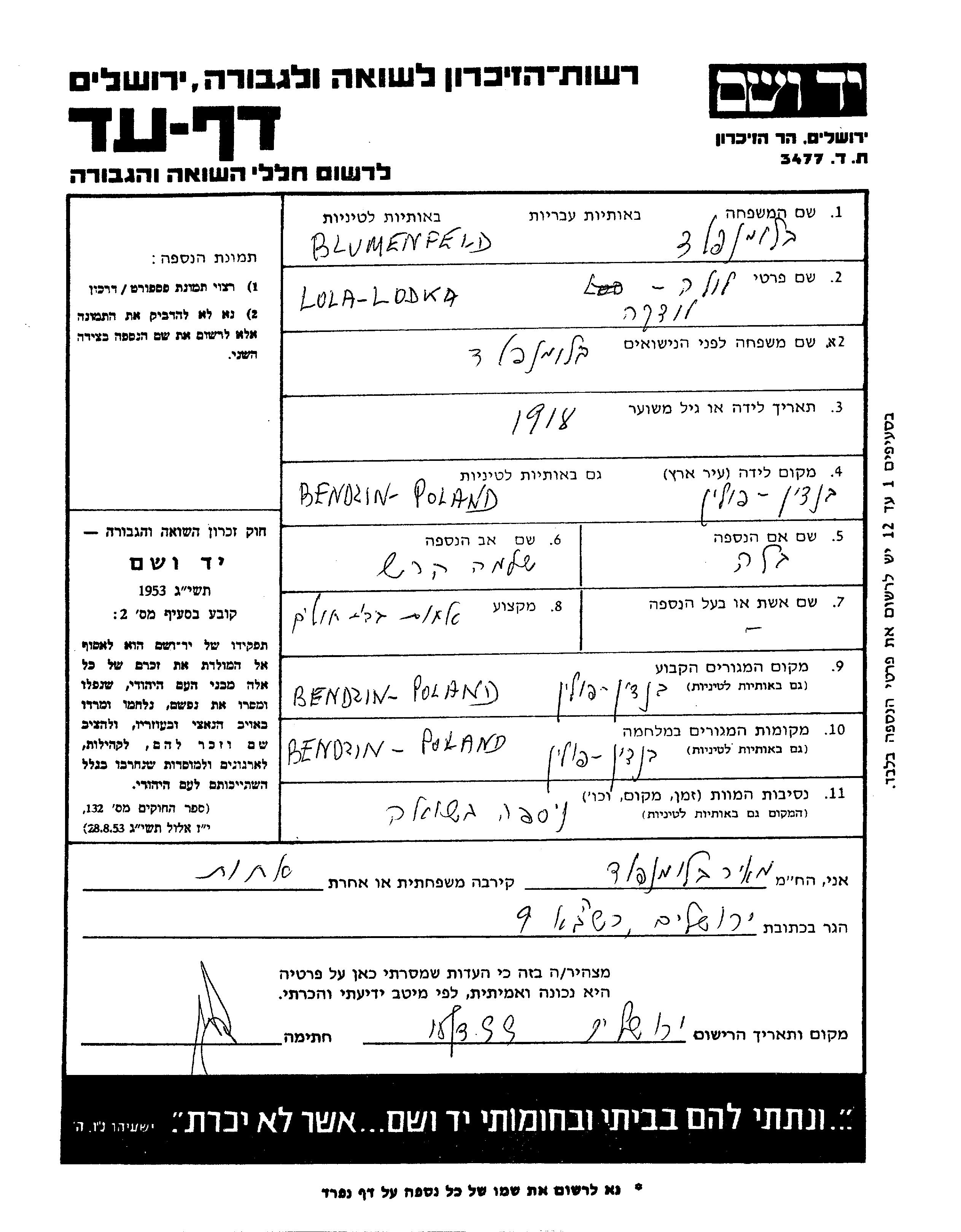 Lodka לולה לאה בלומנפלד לבית בלומנפלד נולדה בשנת 1918. היא היתה אחות. לפני מלחמת העולם השניה התגוררה בBędzin שבפולין.