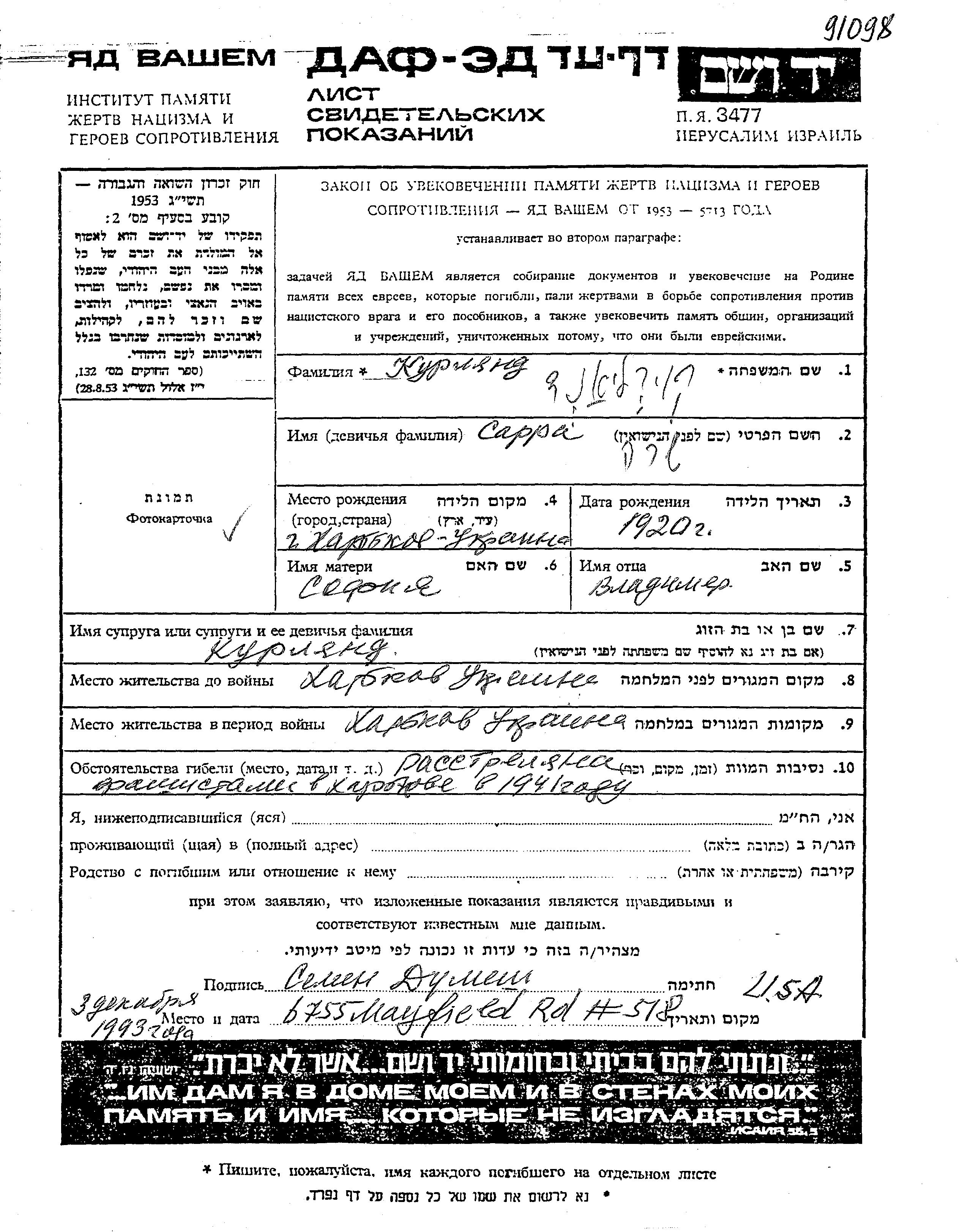 שרה Kurlyand נולדה בKharkov שבאוקראינה (ברה"מ) בשנת 1920. היא היתה תלמידה. לפני מלחמת העולם השניה התגוררה בKharkov שבאוקראינה (ברה"מ).
