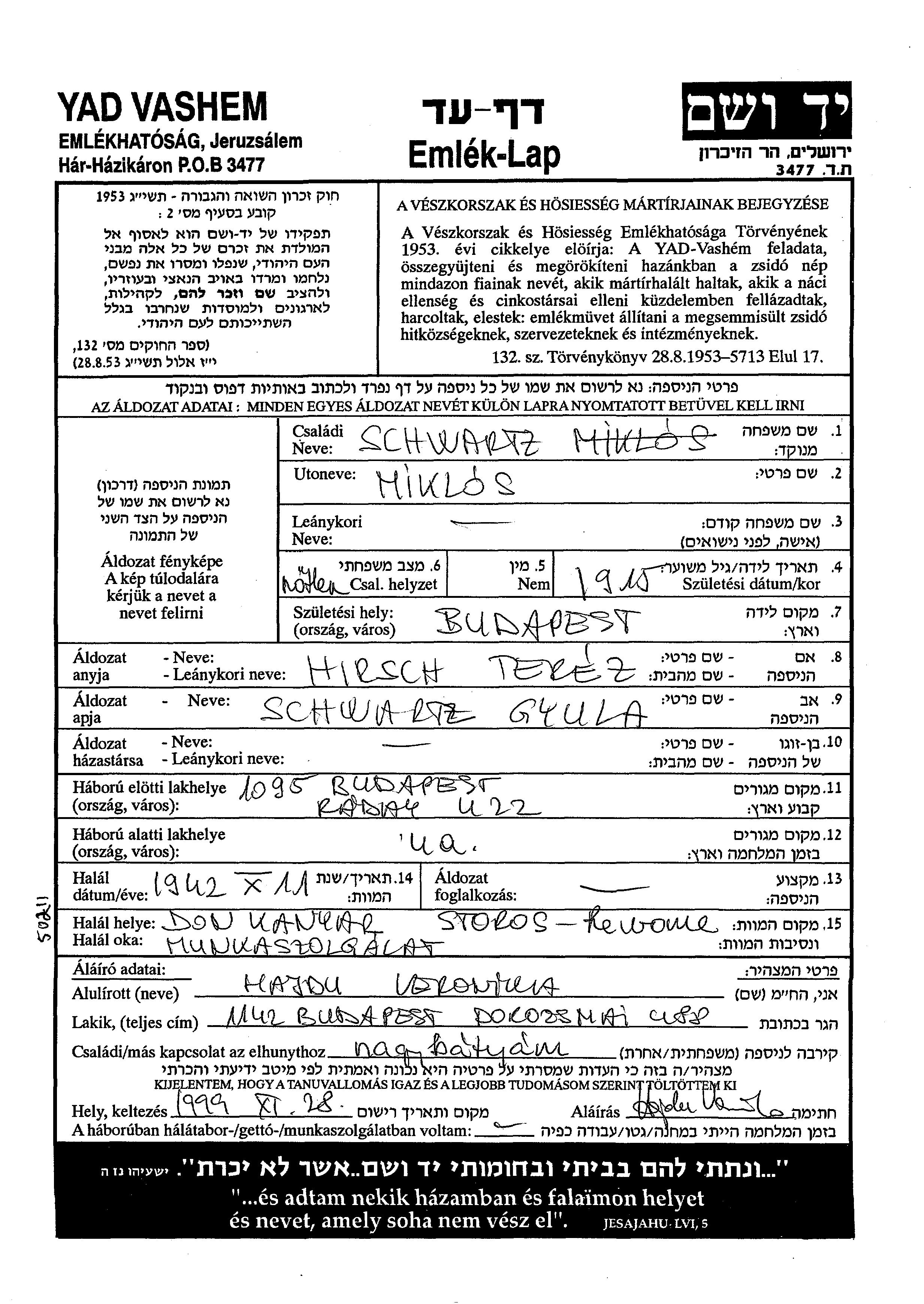 Miklós Schwartz נולד בBudapest שבהונגריה בשנת 1915. הוא היה מוכר בחנות. לפני מלחמת העולם השניה התגורר בBudapest שבהונגריה.