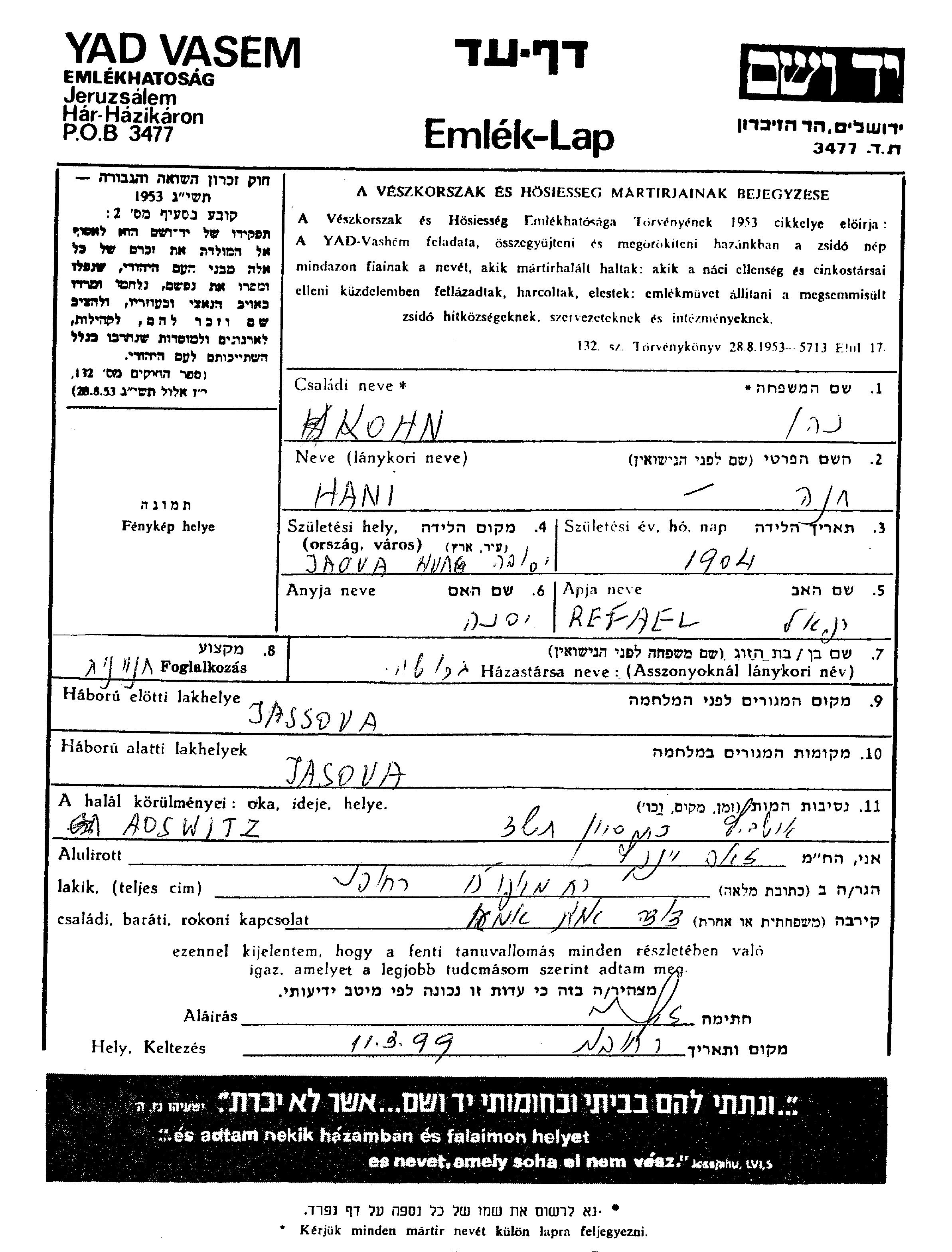 חנה Cohn נולדה בJasova שבצ'כוסלובקיה בשנת 1904. לפני מלחמת העולם השניה התגוררה בJasova שבצ'כוסלובקיה.