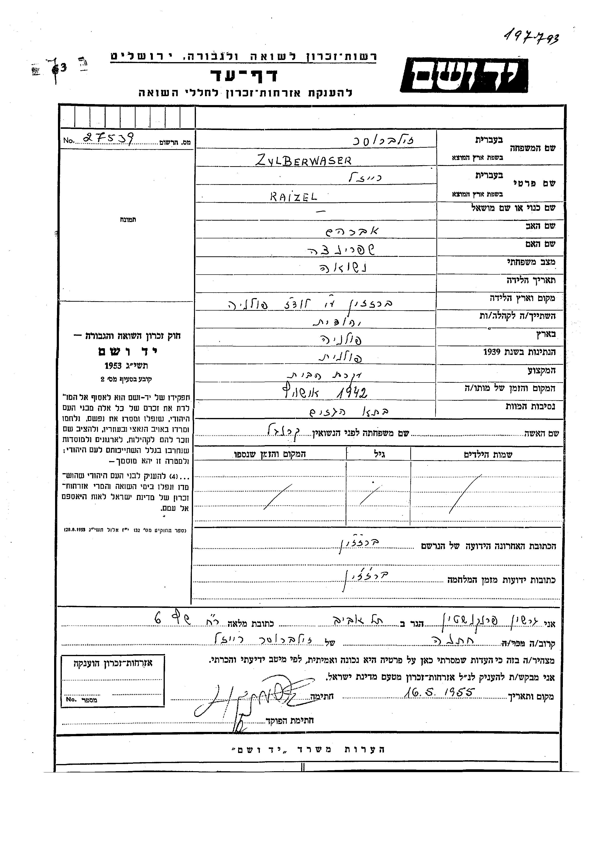 Zylberwaser Raizel Brzeziny, פולין דף-עד