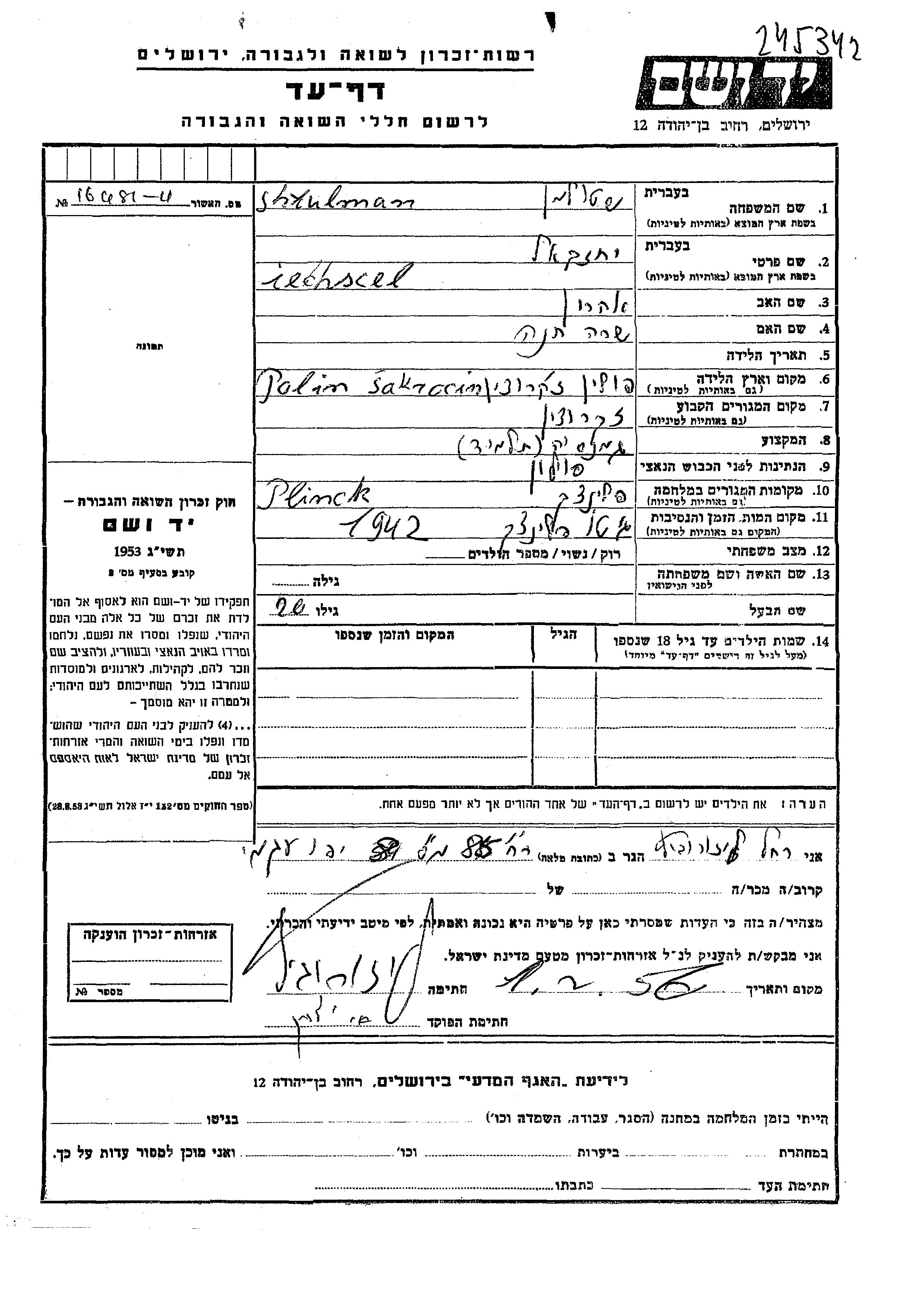 הוא נרצח בשואה. מקום המוות: Plinck שבפולין בשנת 1942.