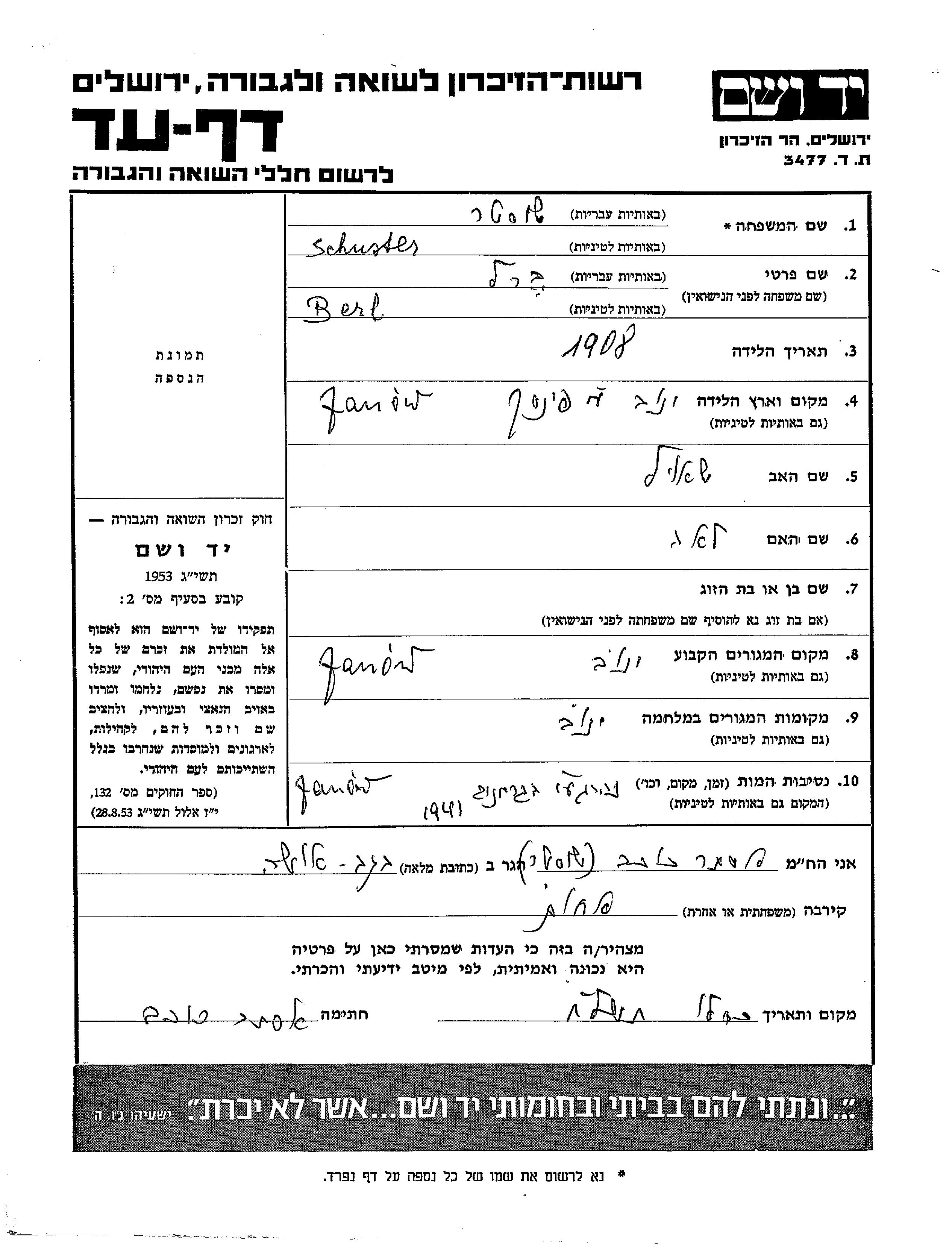 Berl Schuster נולד בJanow שבפולין בשנת 1908 לשאול ולאה. לפני מלחמת העולם השניה התגורר בJanow שבפולין. בזמן המלחמה הוא היה בJanow שבפולין.