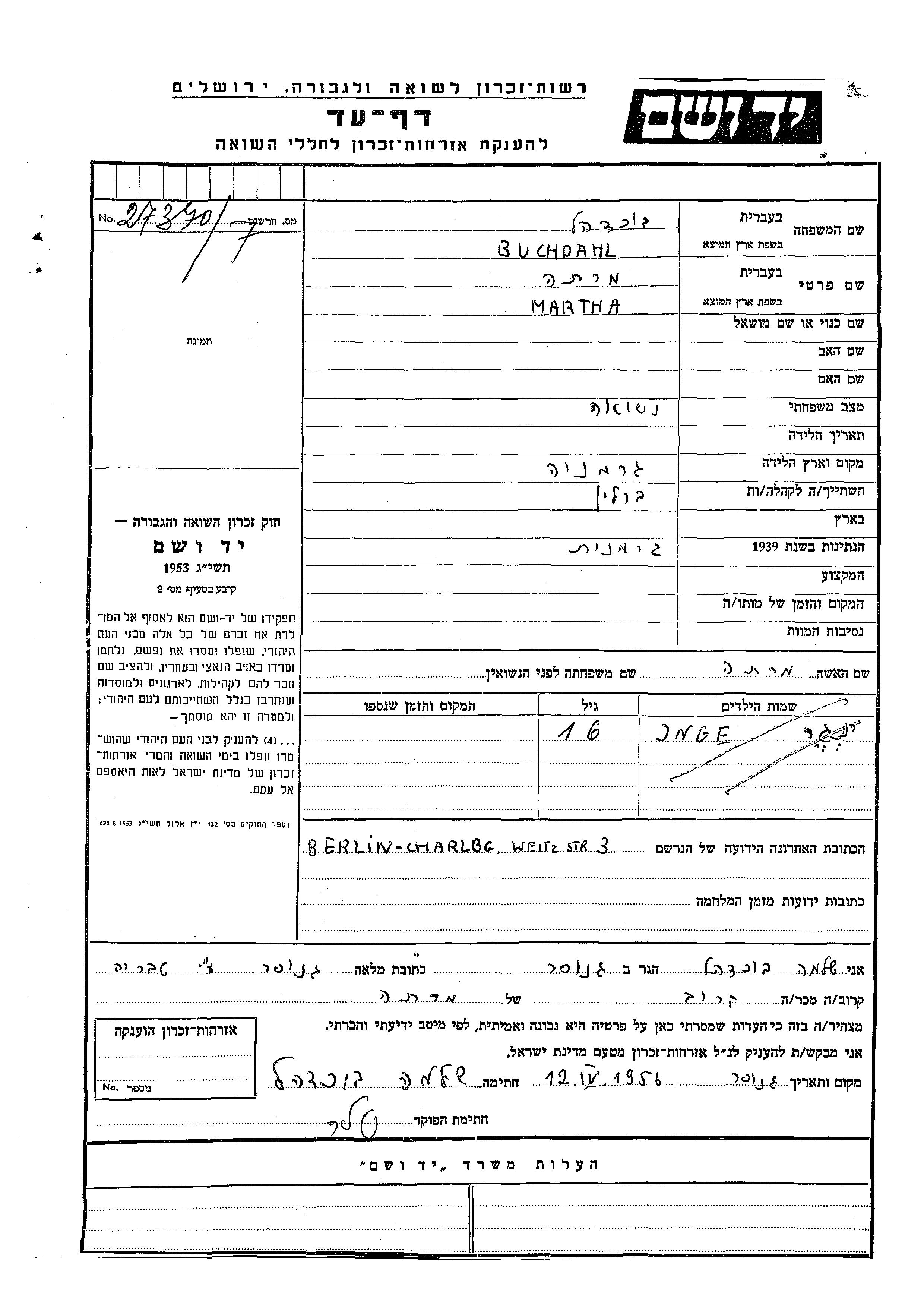 מרתה Buchdahl נולדה בגרמניה. היא היתה נשואה. לפני מלחמת העולם השניה התגוררה בBerlin שבגרמניה. בזמן המלחמה היא היתה בBerlin שבגרמניה.
