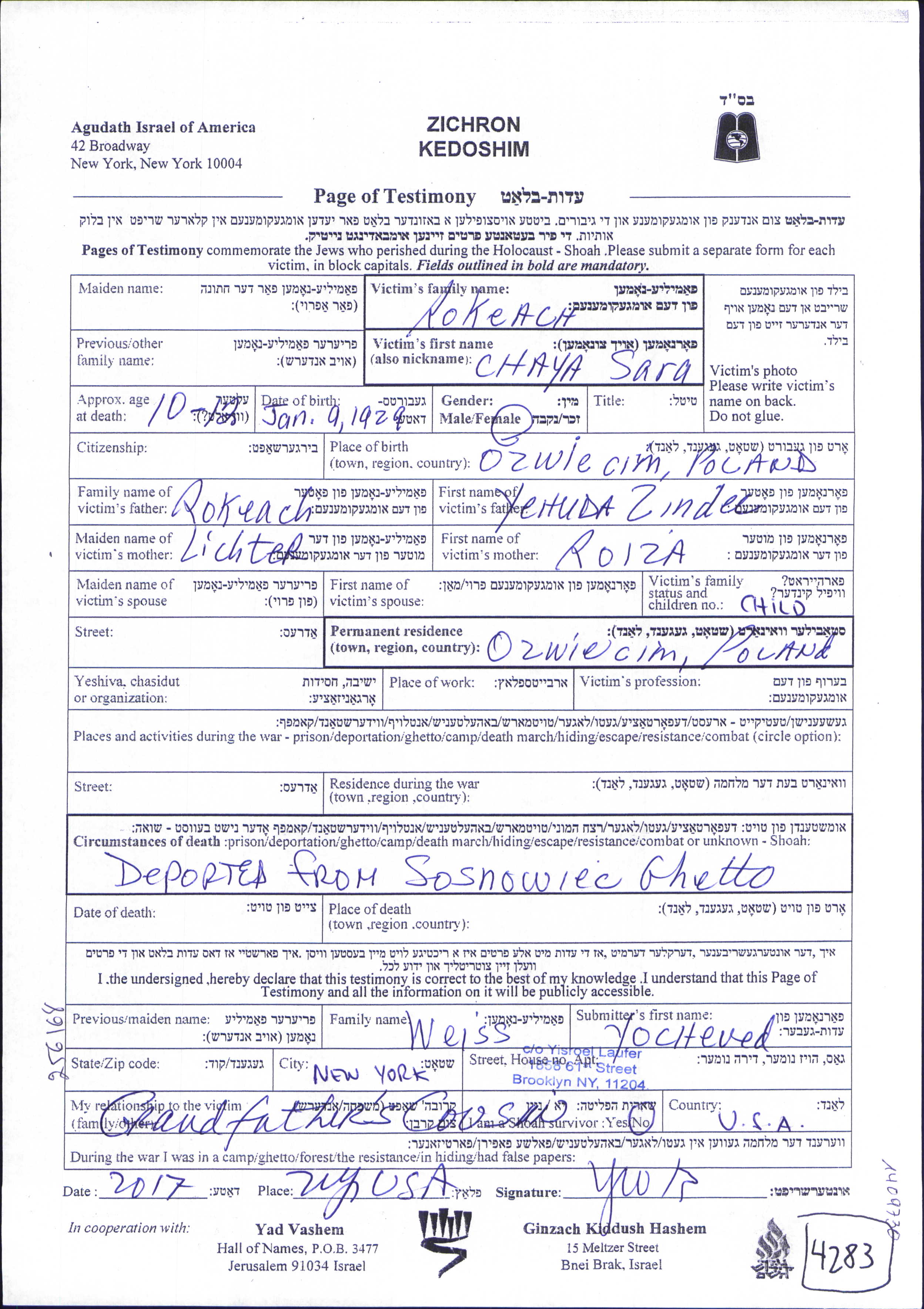 Chaya Sara Rokach נולדה בOświęcim שבפולין בשנת 1929. לפני מלחמת העולם השניה התגוררה בOświęcim שבפולין.