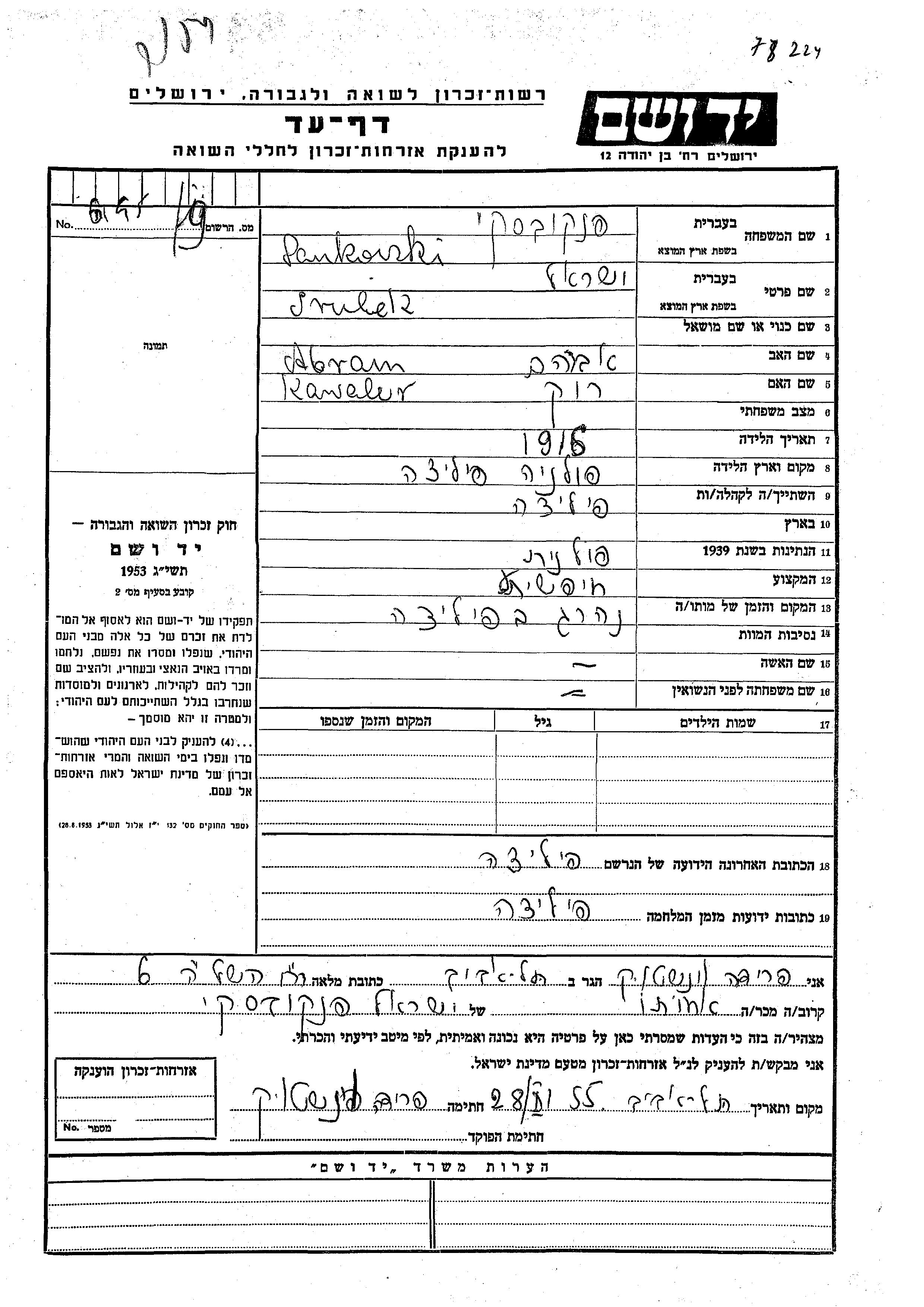 ישראל Pankovski נולד בPilica שבפולין בשנת 1916. הוא היה מקצוע חופשי. לפני מלחמת העולם השניה התגורר בPilica שבפולין.