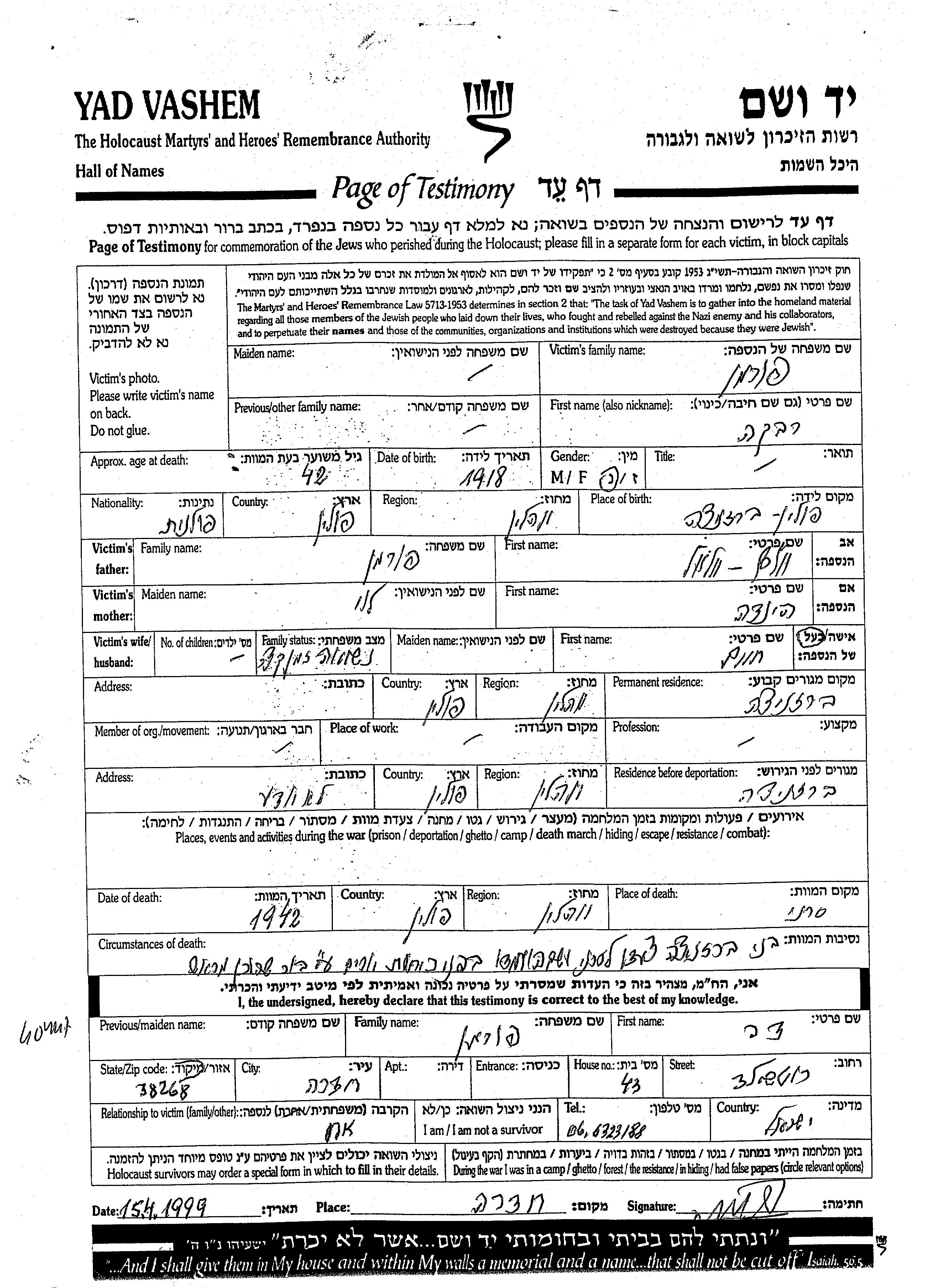 פורמן | רבקה | 1918 | Bereznica, פולין | דף-עד |