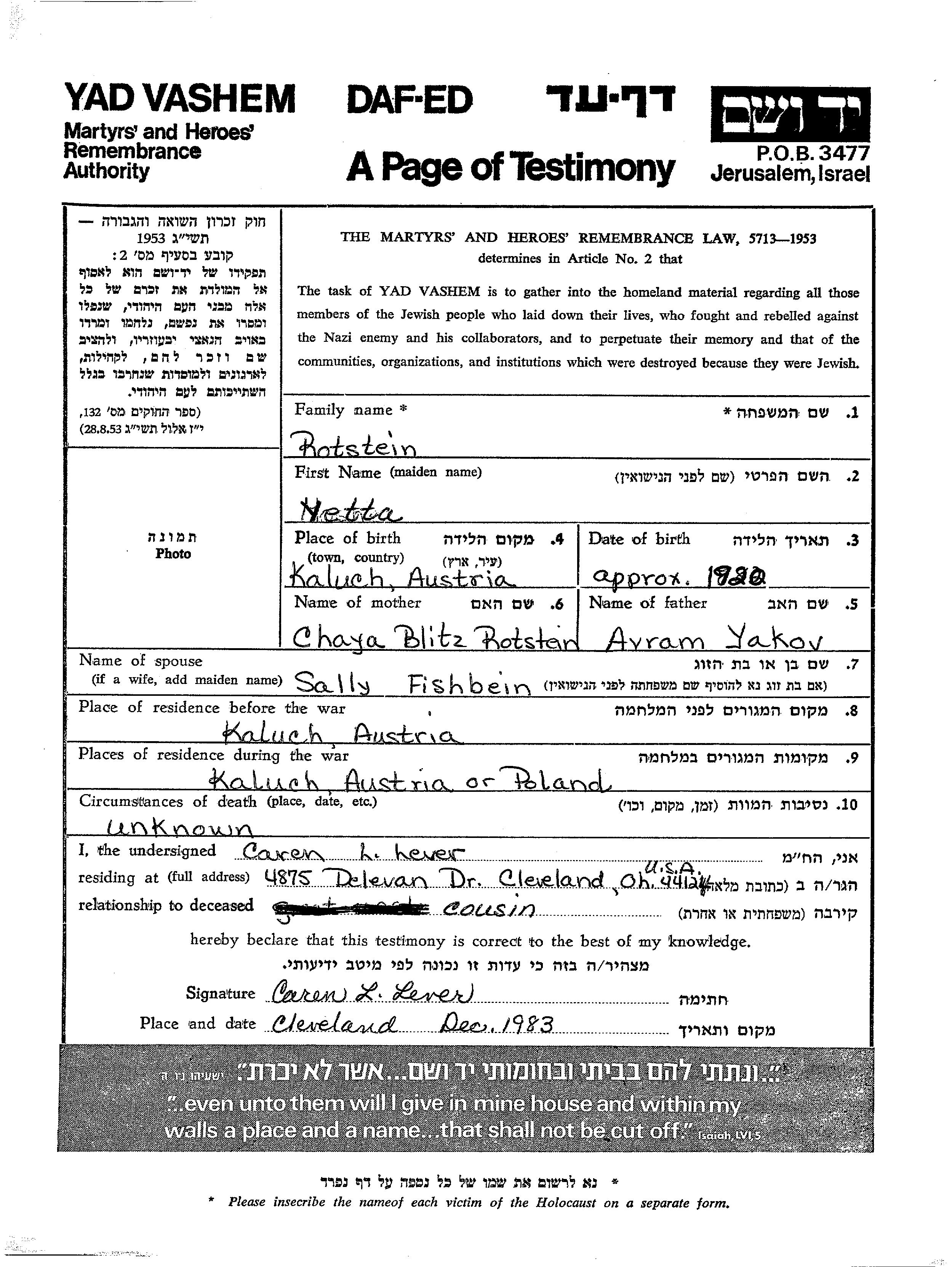 Yetta פישביין Rotstein לבית Rotstein נולדה בKaluch שבאוסטריה בשנת 1922 לAvram Yakov וChaya. היא היתה נשואה לSally. לפני מלחמת העולם השניה התגוררה בKaluch שבאוסטריה. בזמן המלחמה היא היתה בKaluch שבאוסטריה.