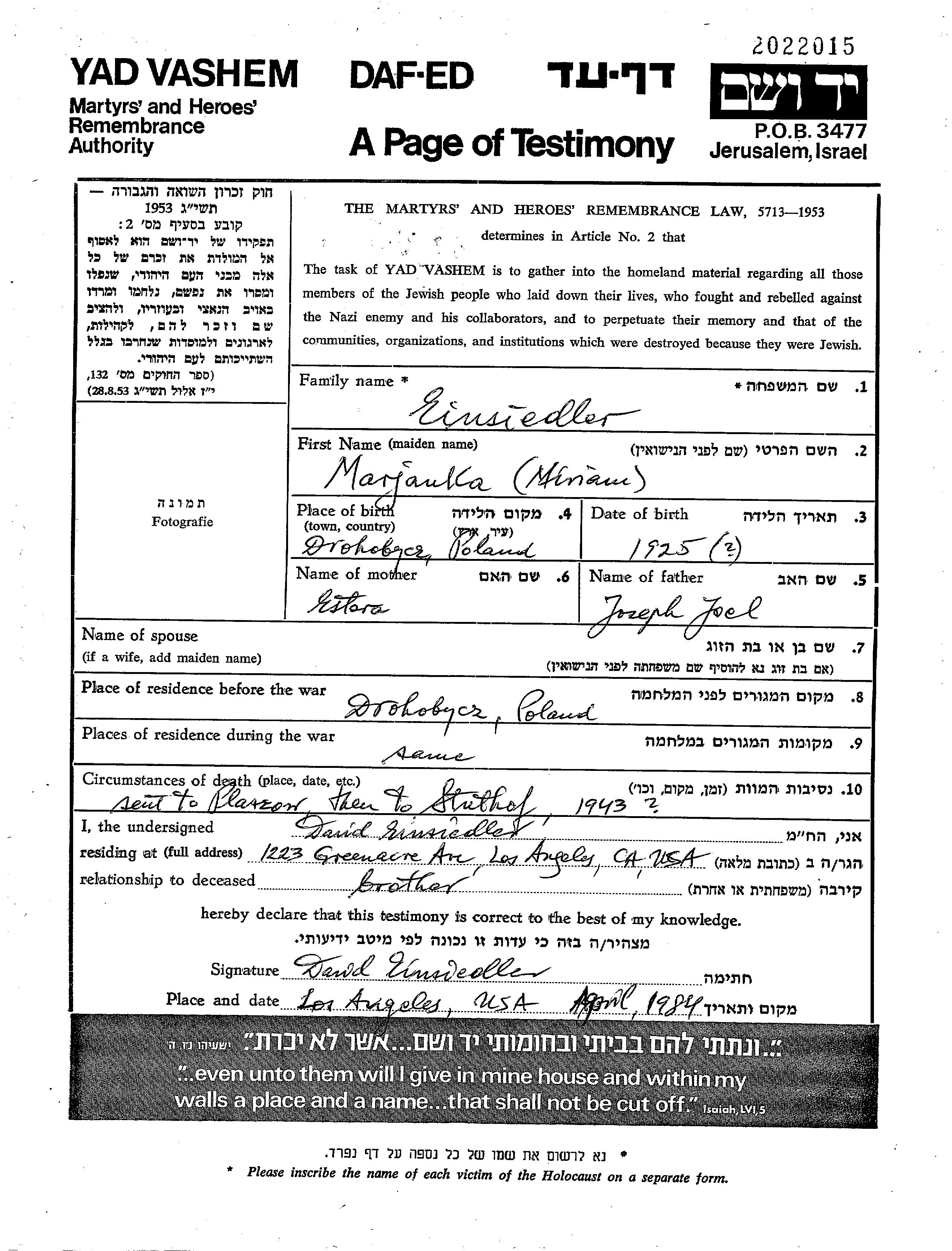 מרים Marjanka Einsiedler נולדה בDrohobycz שבפולין בשנת 1925. היא היתה תלמידה. לפני מלחמת העולם השניה התגוררה בDrohobycz שבפולין.