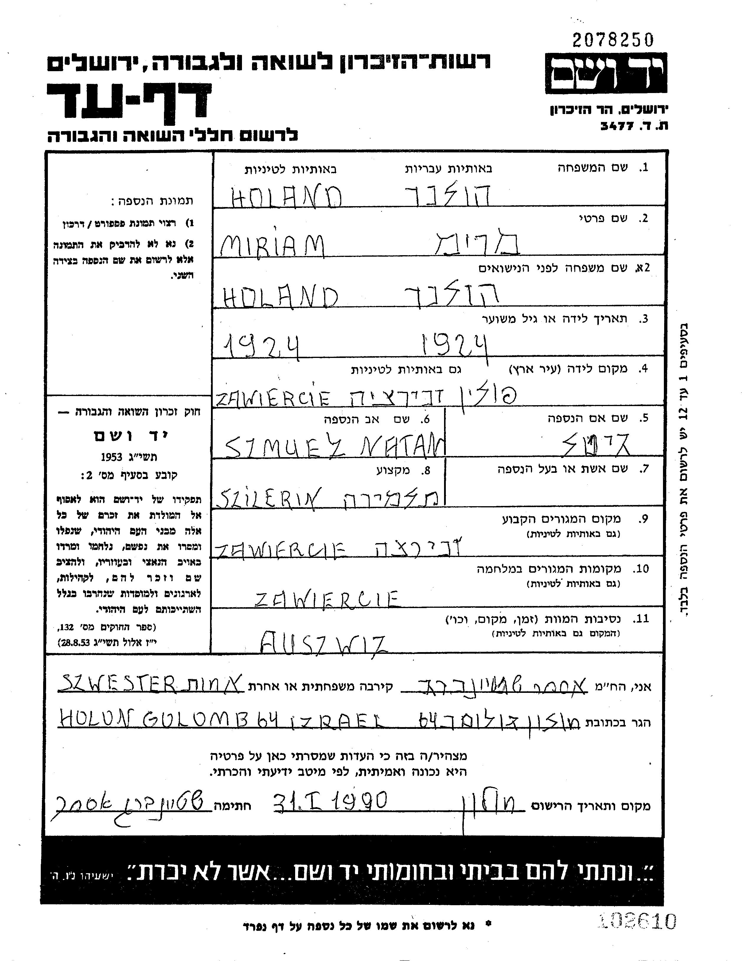 מרים Holland נולדה בZawiercie שבפולין בשנת 1925. היא היתה תלמידה. לפני מלחמת העולם השניה התגוררה בZawiercie שבפולין.