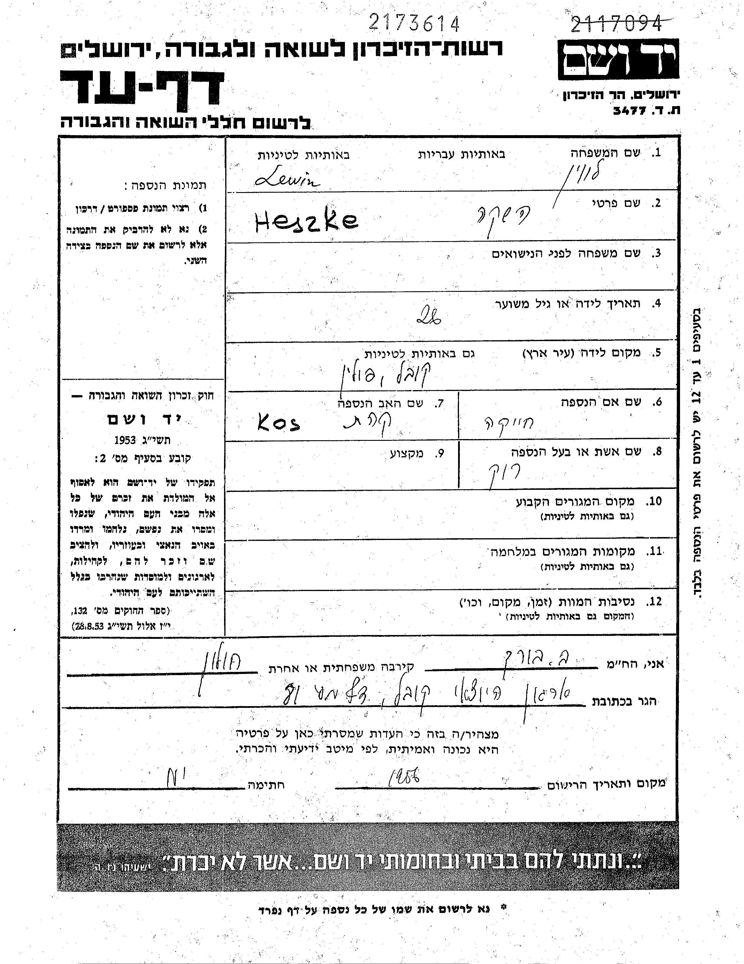 Heszke העשקע Lewin נולד בKowel שבפולין בשנת 1913. לפני מלחמת העולם השניה התגורר בKowel שבפולין.