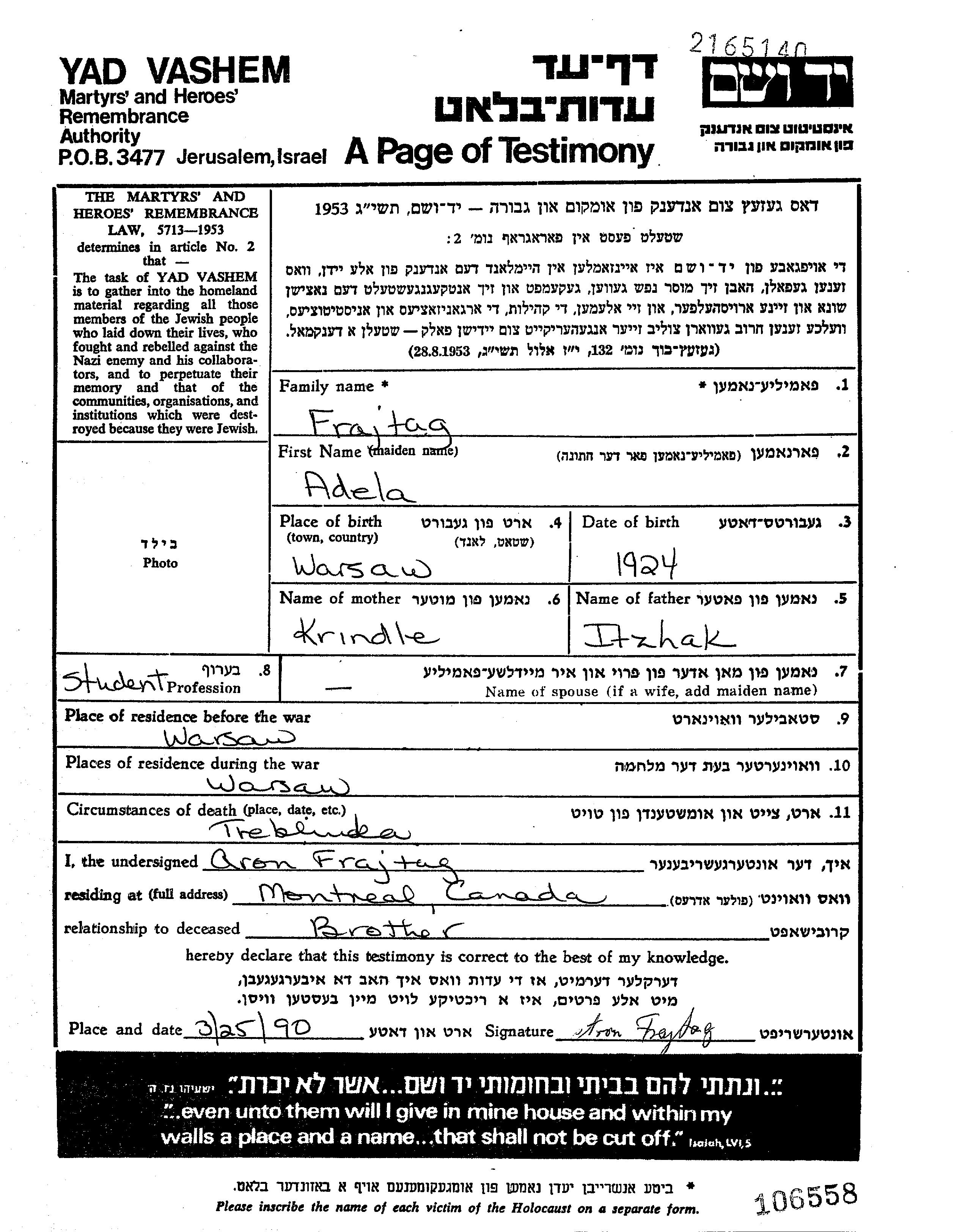 אדלה Frajtag נולדה בWarszawa שבפולין בשנת 1924. היא היתה סטודנטית. לפני מלחמת העולם השניה התגוררה בWarszawa שבפולין.