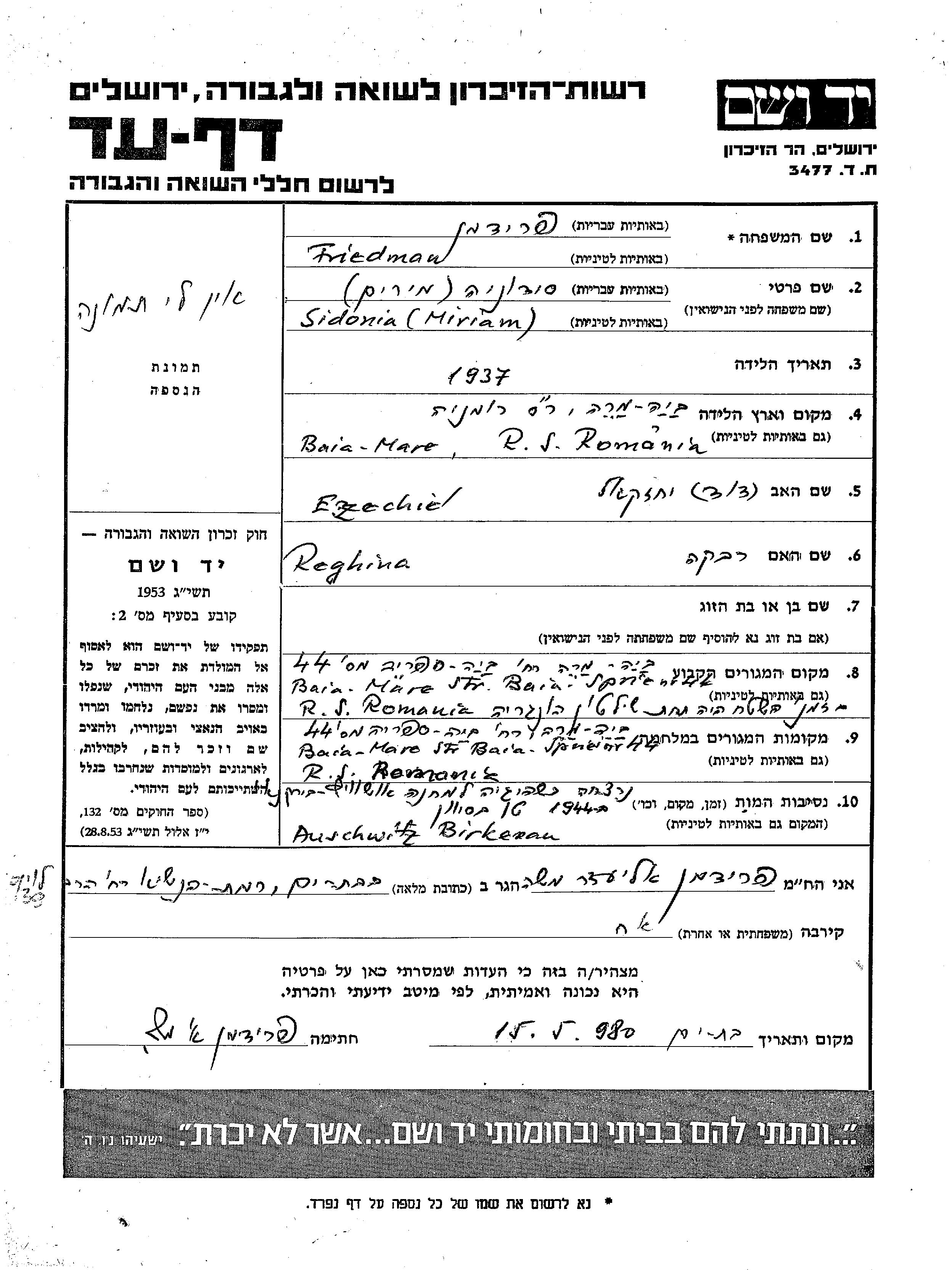 מרים סידוניה Friedman נולדה בBaia Mare שברומניה בשנת 1937. לפני מלחמת העולם השניה התגוררה בBaia Mare שברומניה.