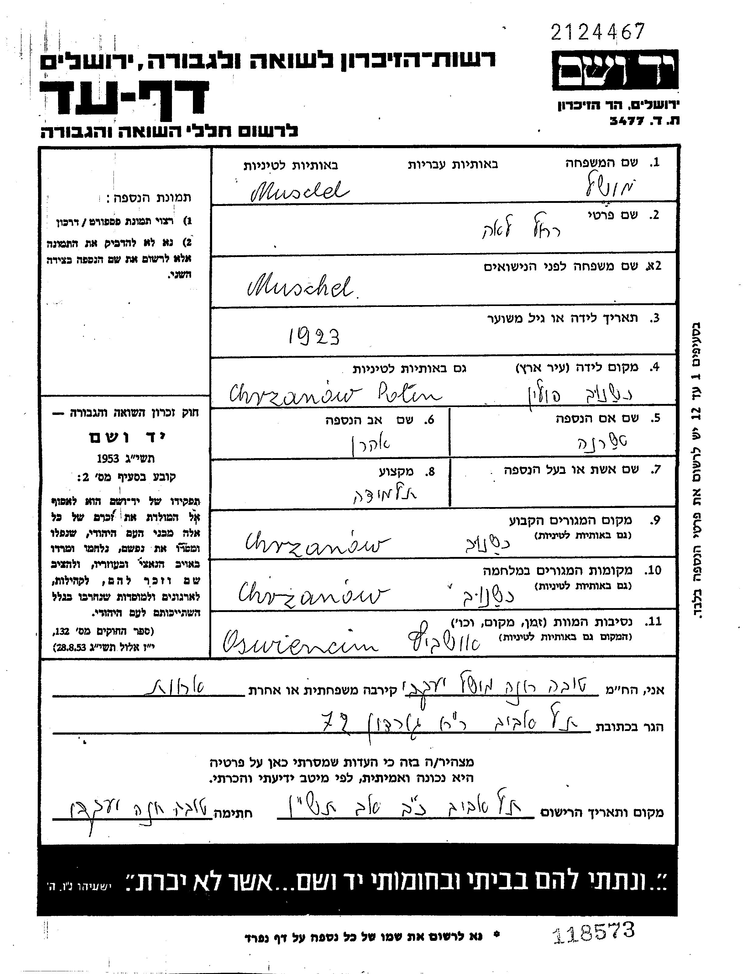 לאה רחל Muschel נולדה בChrzanow שבפולין בשנת 1923. היא היתה תלמידה. לפני מלחמת העולם השניה התגוררה בChrzanow שבפולין.