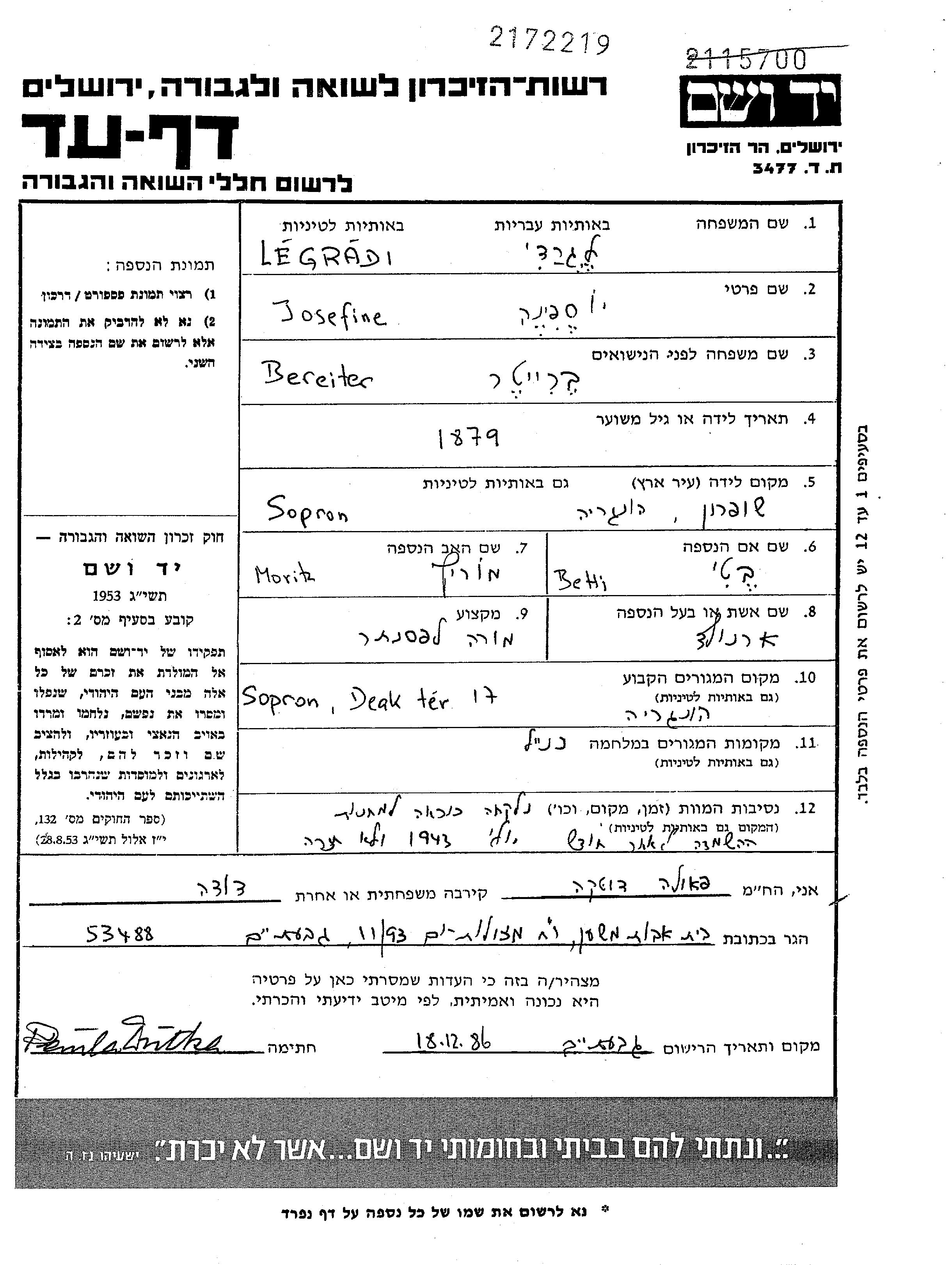 Josephine לגרדי לבית Bereiter נולדה בSopron שבהונגריה בשנת 1879. לפני מלחמת העולם השניה התגוררה בSopron שבהונגריה.
