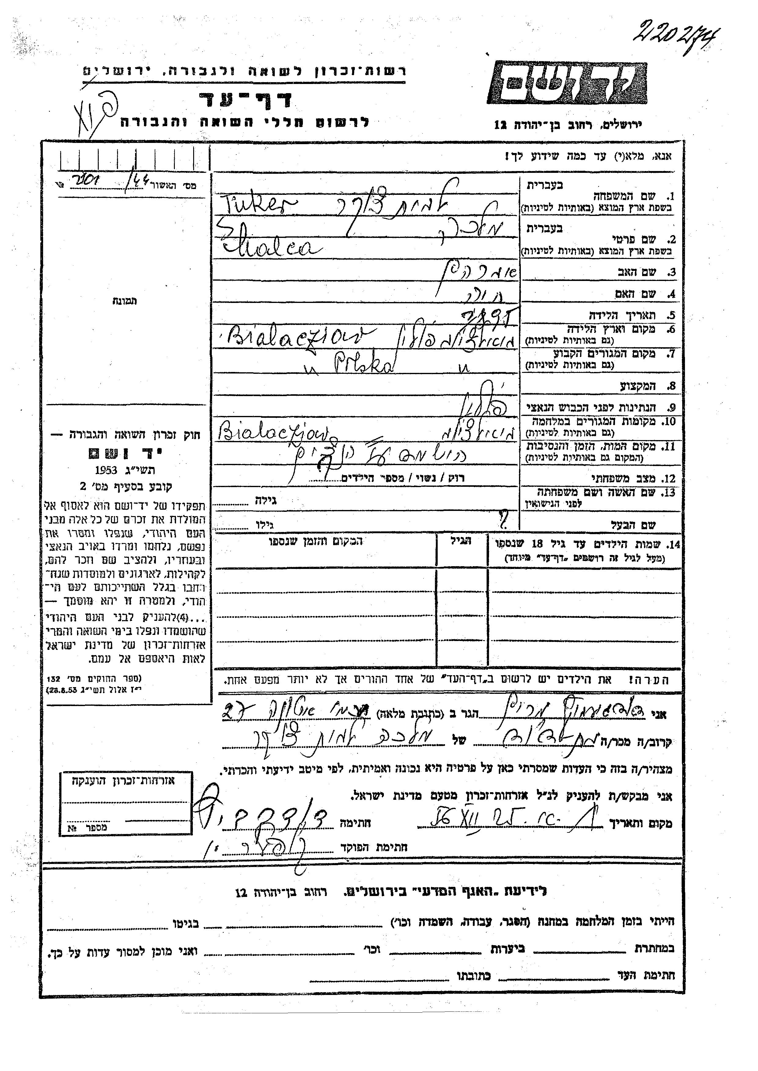 מלכה Malia צוקר טוקר נולדה בBialaczow שבפולין בשנת 1892. לפני מלחמת העולם השניה התגוררה בBialaczow שבפולין.