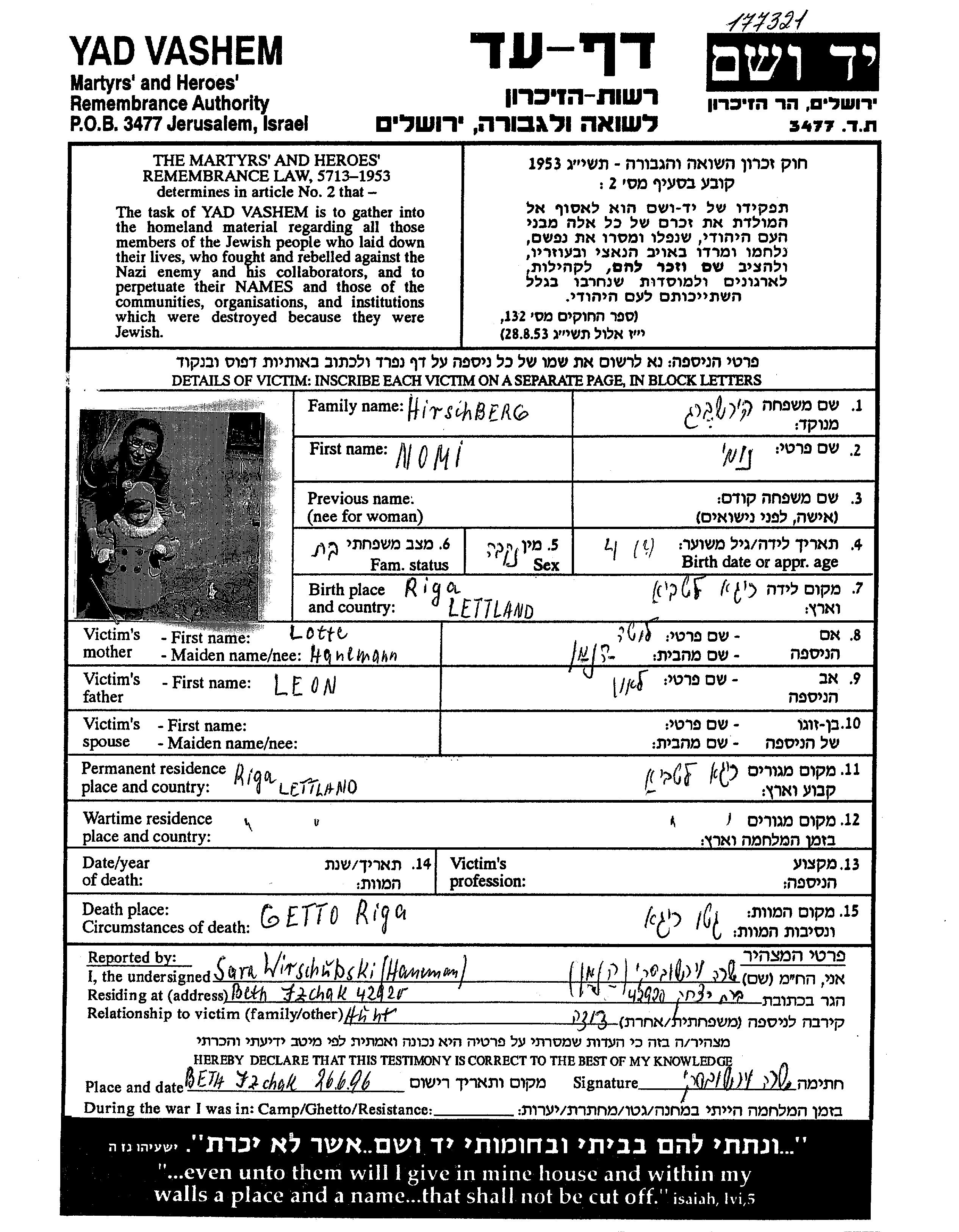 נעמי Hirschberg נולדה בRiga שבלטביה בשנת 1936. לפני מלחמת העולם השניה התגוררה בRiga שבלטביה.