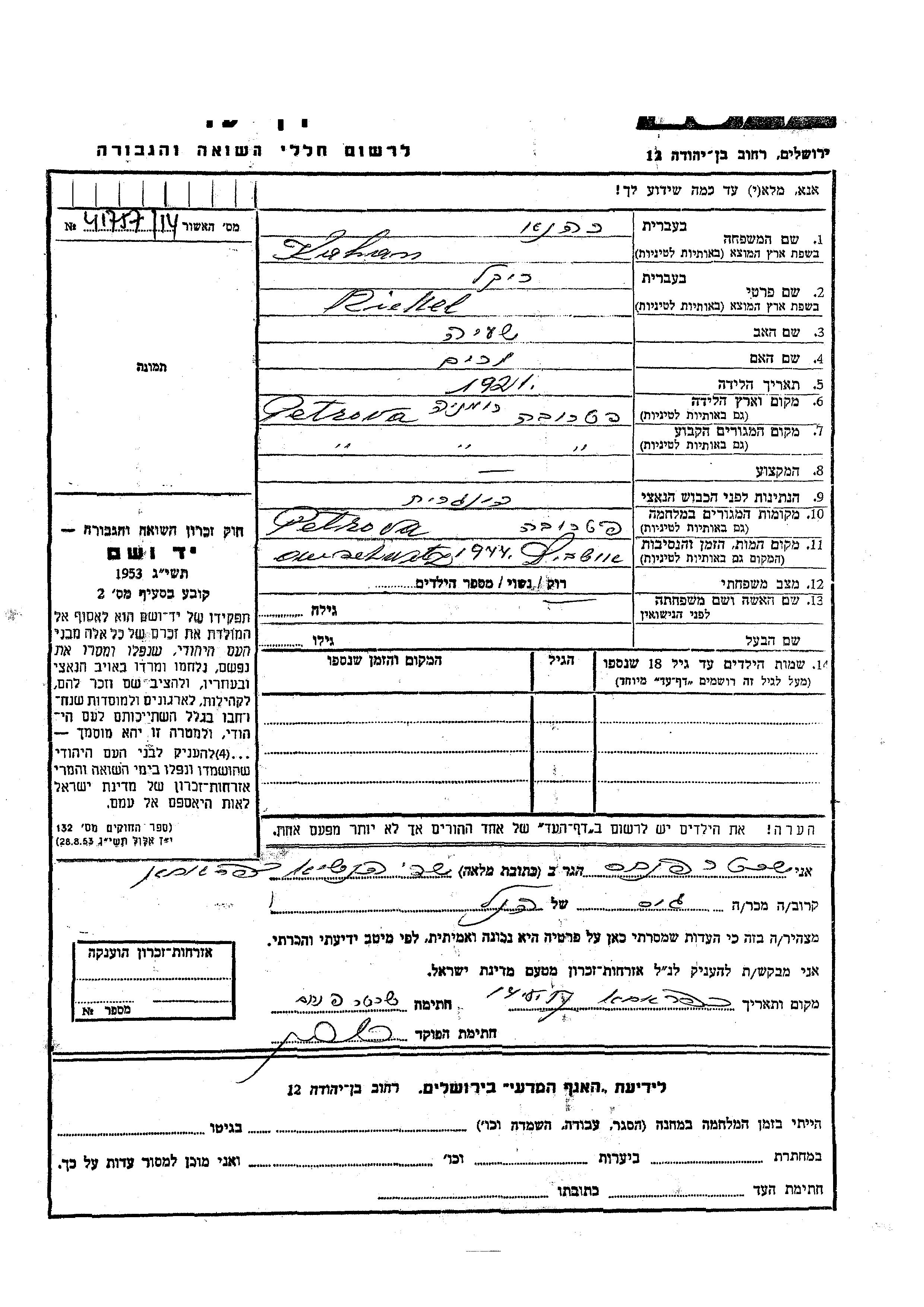שאלון לרישום ניצולי שואה