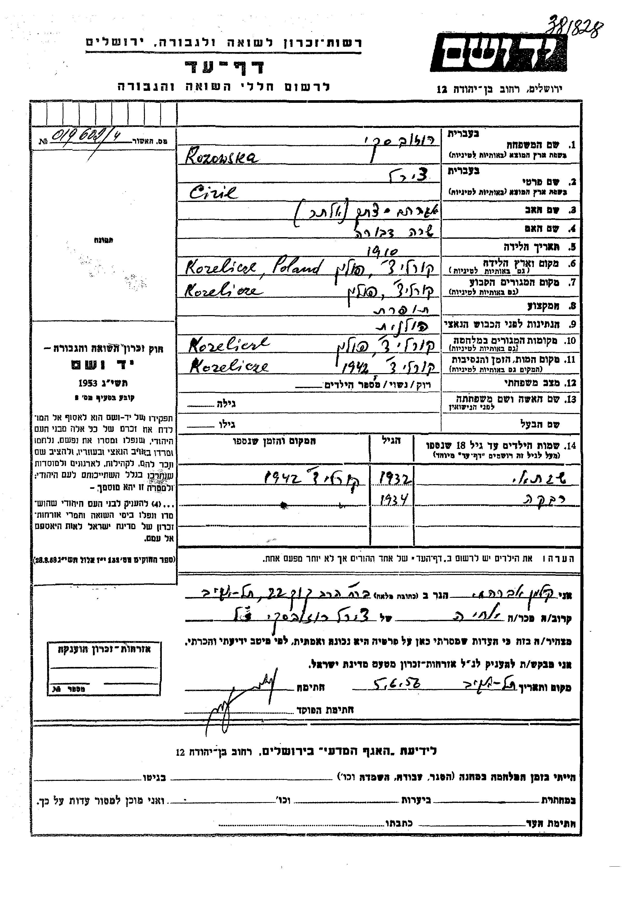 Ciril Rozowska נולדה בKorelicze שבפולין בשנת 1910. לפני מלחמת העולם השניה התגוררה בKorelicze שבפולין.