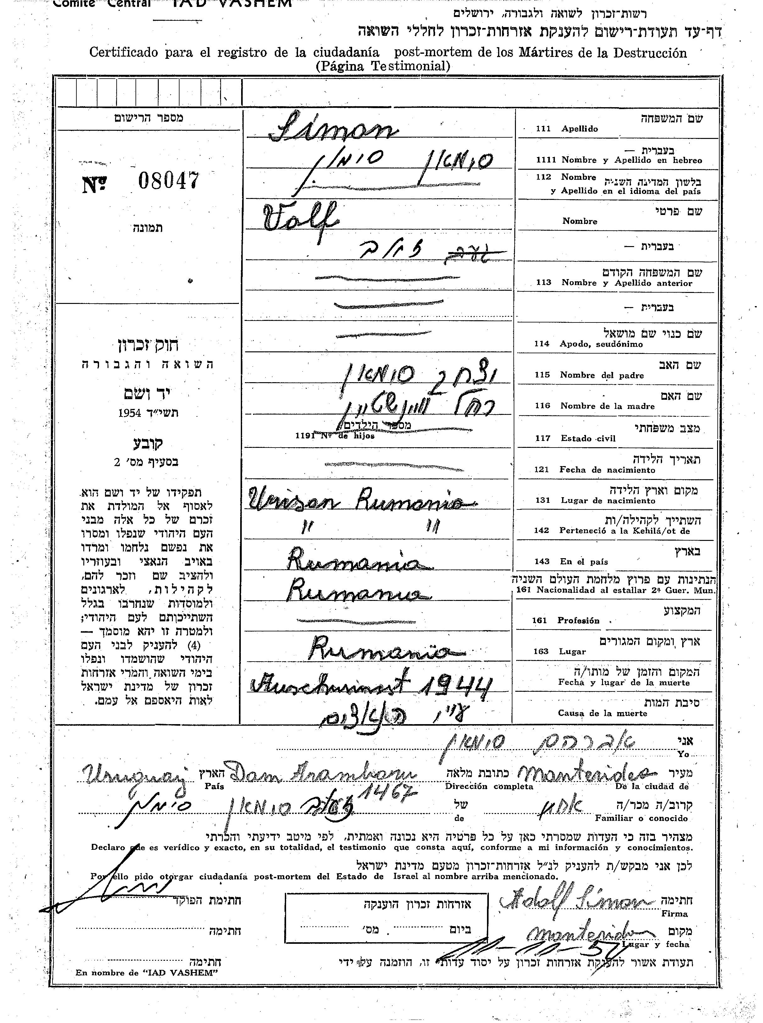 וולף זאב סימאן סימון נולד בUrisor שברומניה. לפני מלחמת העולם השניה התגורר בUrisor שברומניה.