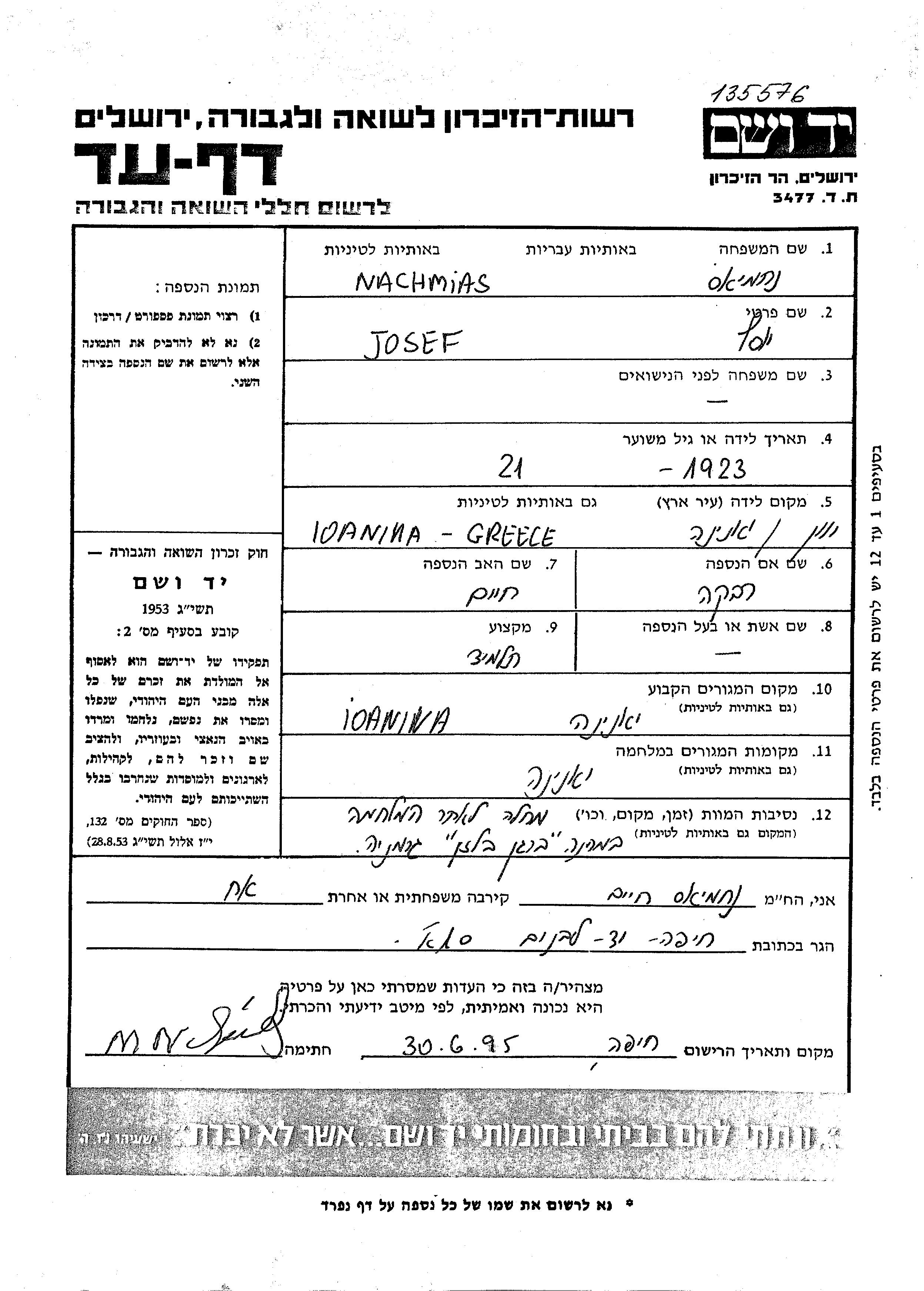 יוסף Nachmias נולד בIoannina שביון בשנת 1923. הוא היה תלמיד. לפני מלחמת העולם השניה התגורר בIoannina שביון.