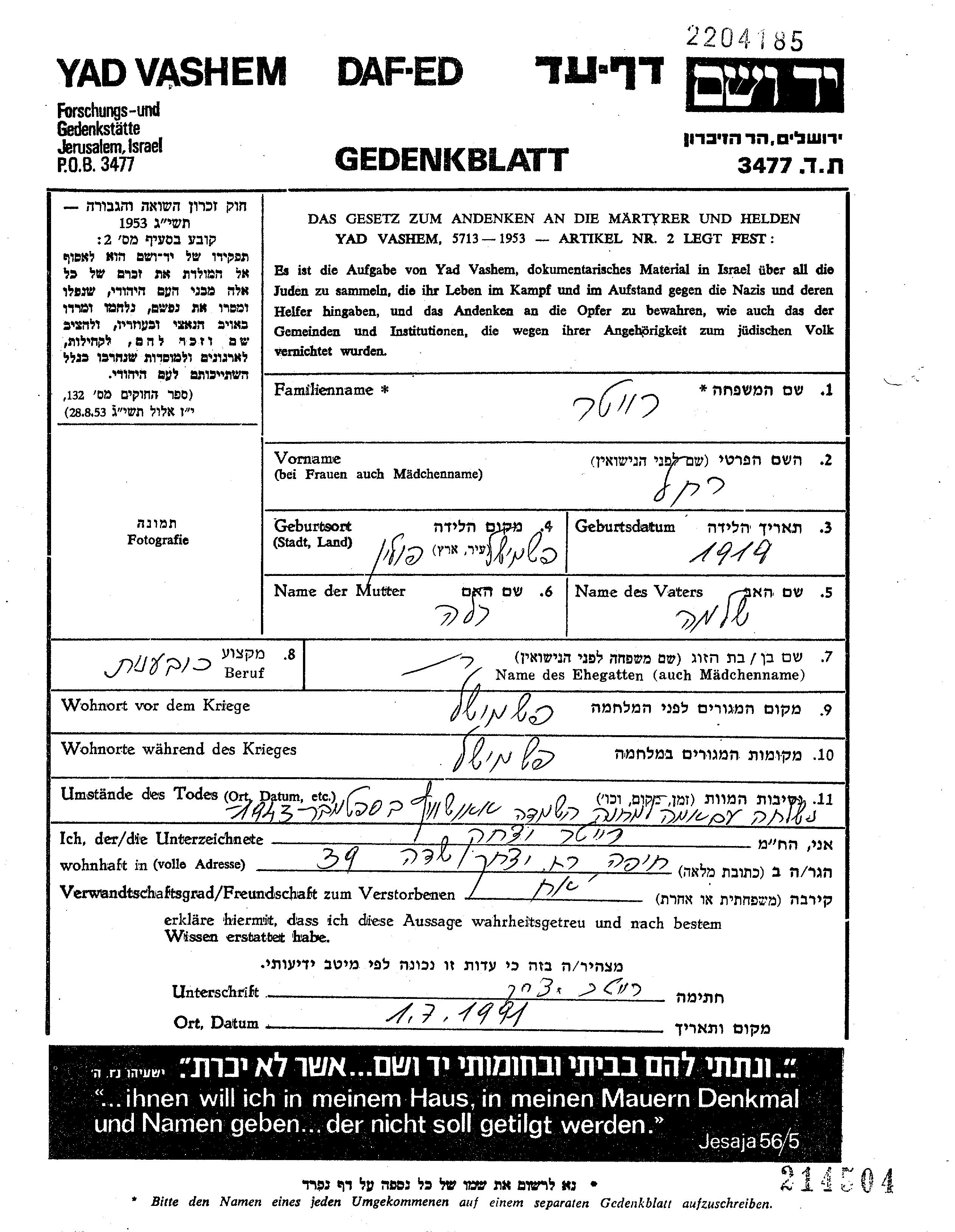 יד ושם - המפעל להנצחת השמות בדפי עד