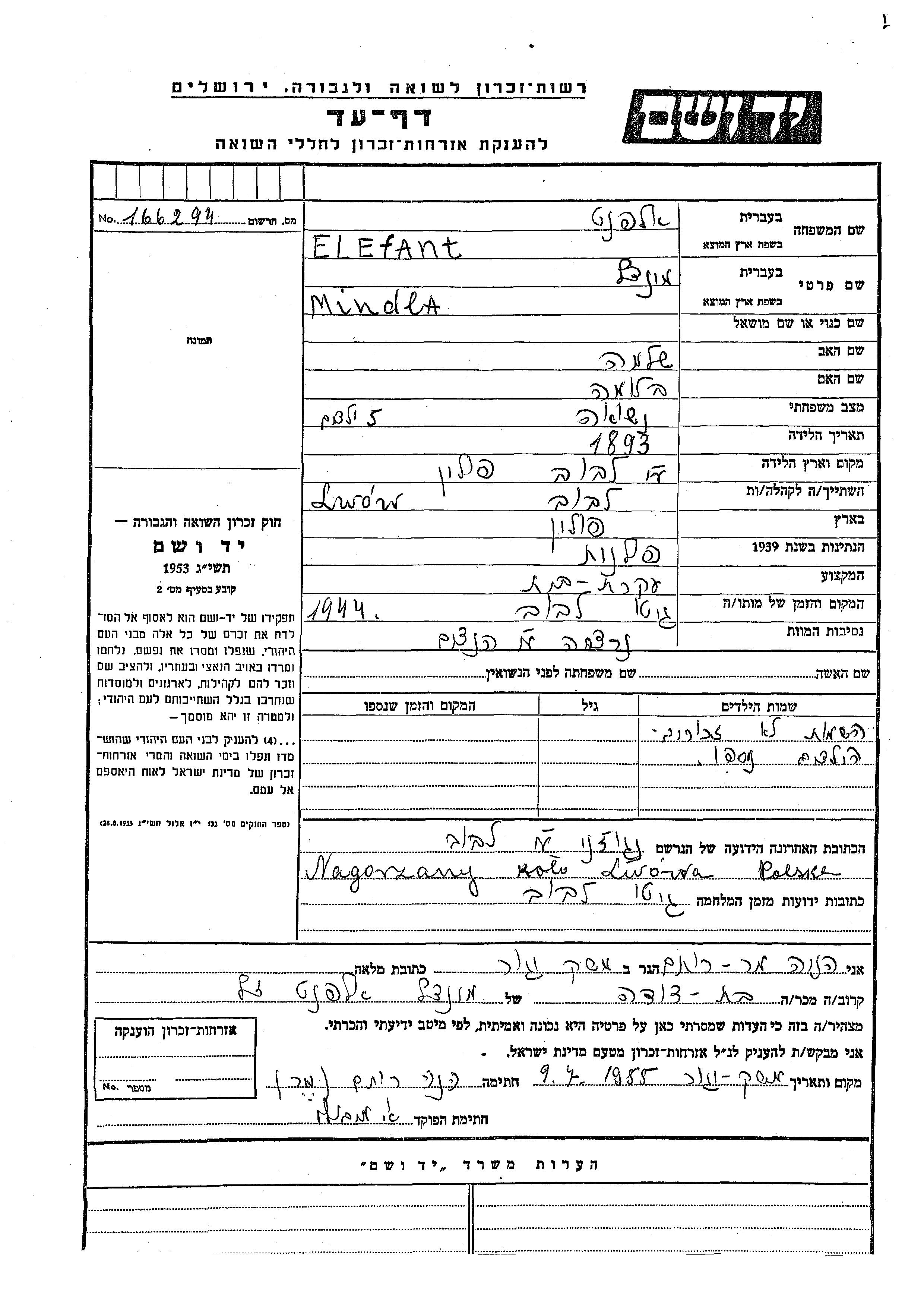 מנשה Mindla Elfant נולדה בLwow שבפולין בשנת 1893. היא היתה עקרת בית. לפני מלחמת העולם השניה התגוררה בLwow שבפולין.