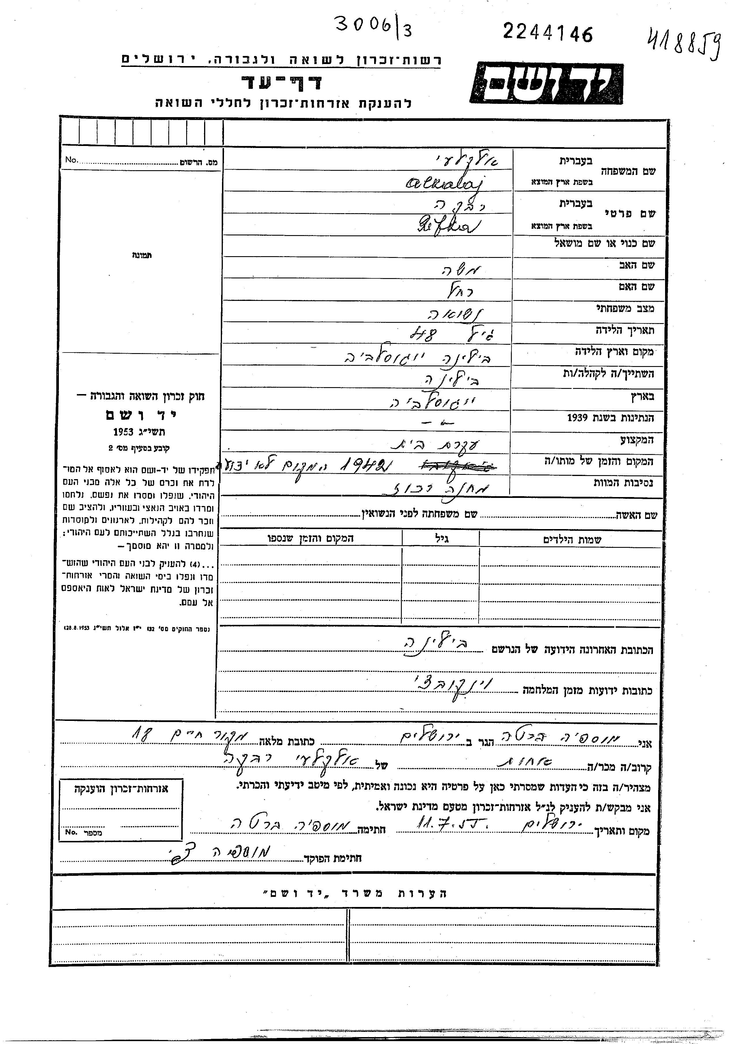 ריפקה Alkalaj לבית ברוך נולדה בBjelina שביוגוסלביה בשנת 1894 למשה ורחל. היא היתה עקרת בית ונשואה לישראל. לפני מלחמת העולם השניה התגוררה בBjelina שביוגוסלביה. בזמן המלחמה היא היתה בVinkovci שביוגוסלביה. ריפקה נרצחה בשואה.