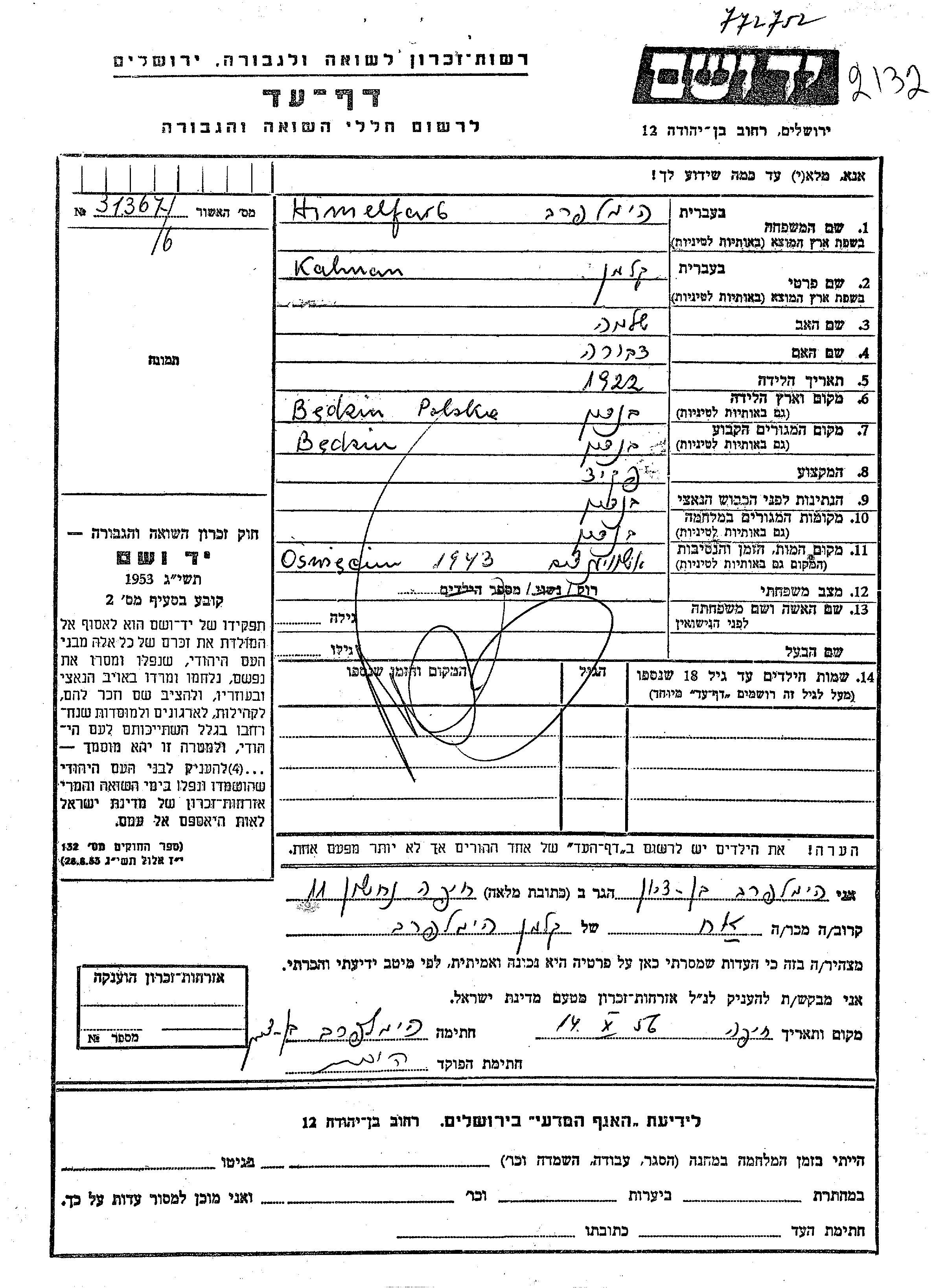 הימלפרב קלמה Jehuda 1920 Będzin, פולין דף-עד