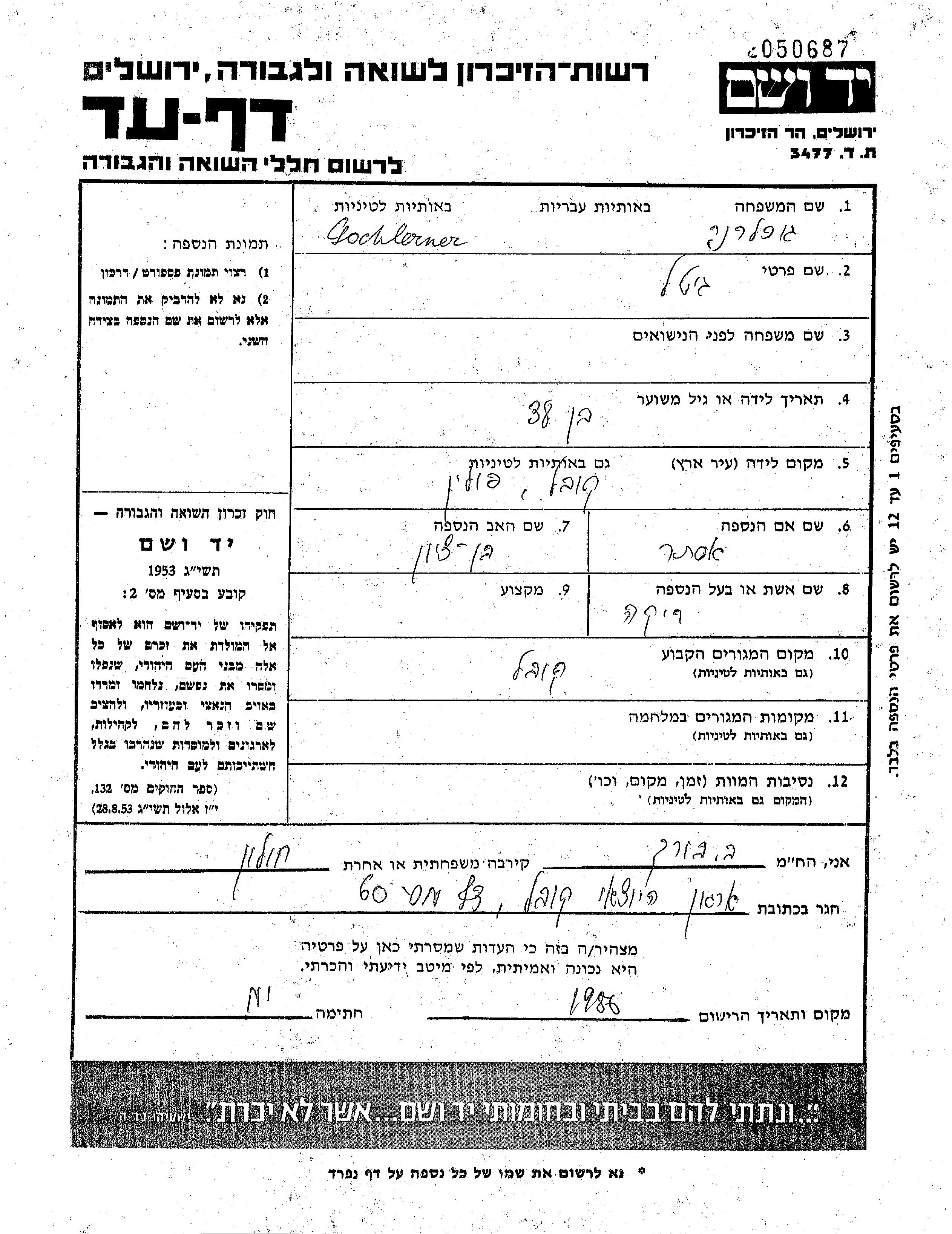 Gitl Gochlerner נולדה בKowel שבפולין בשנת 1901. לפני מלחמת העולם השניה התגוררה בKowel שבפולין.