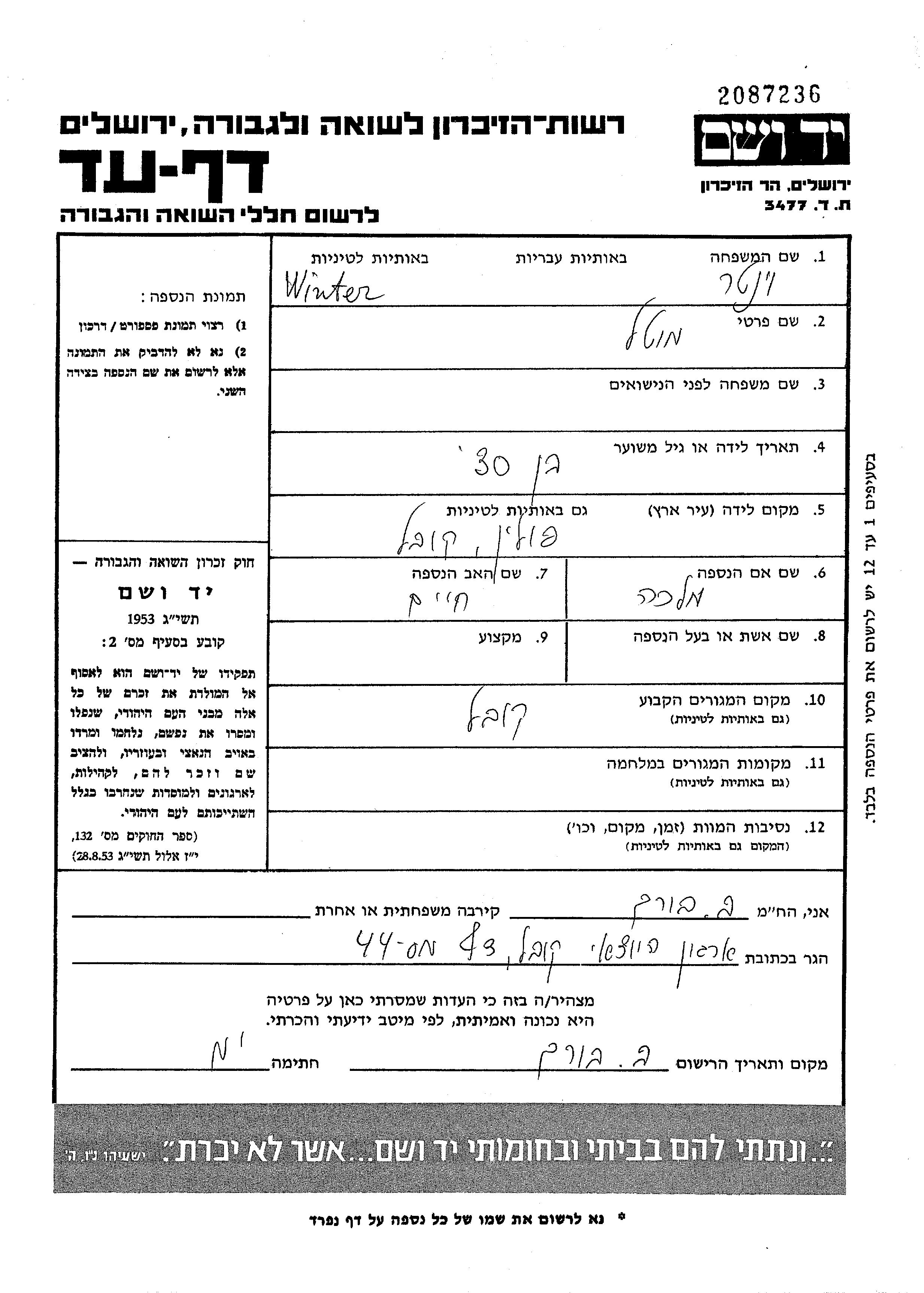 Winter Mosze Mordechaj 1908 Kowel, פולין דף-עד