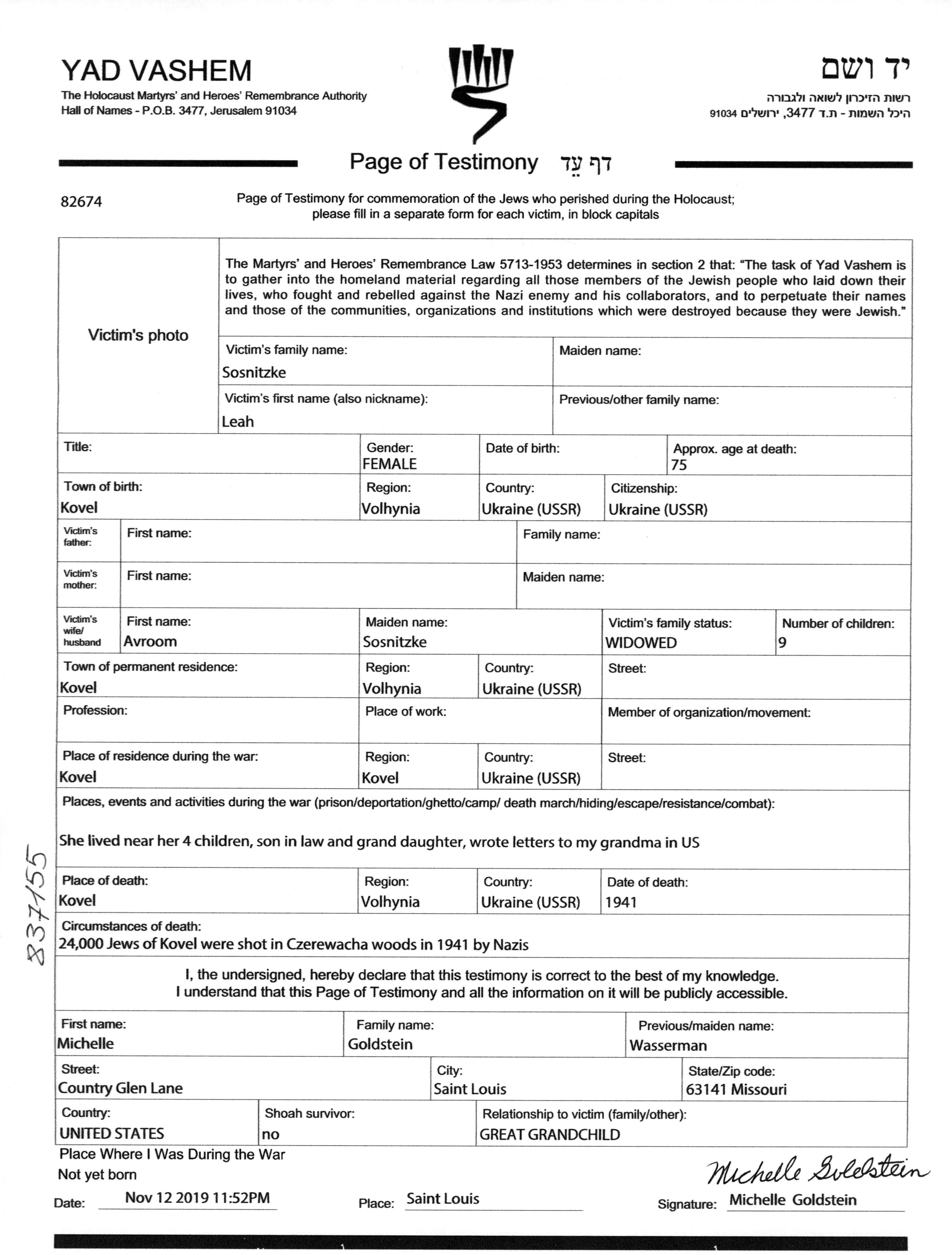 Leah Sosnitzke נולדה בKovel שבפולין. היא היתה אלמנה לAvroom. לפני מלחמת העולם השניה התגוררה בKovel שבפולין. בזמן המלחמה היא היתה בKovel שבפולין.