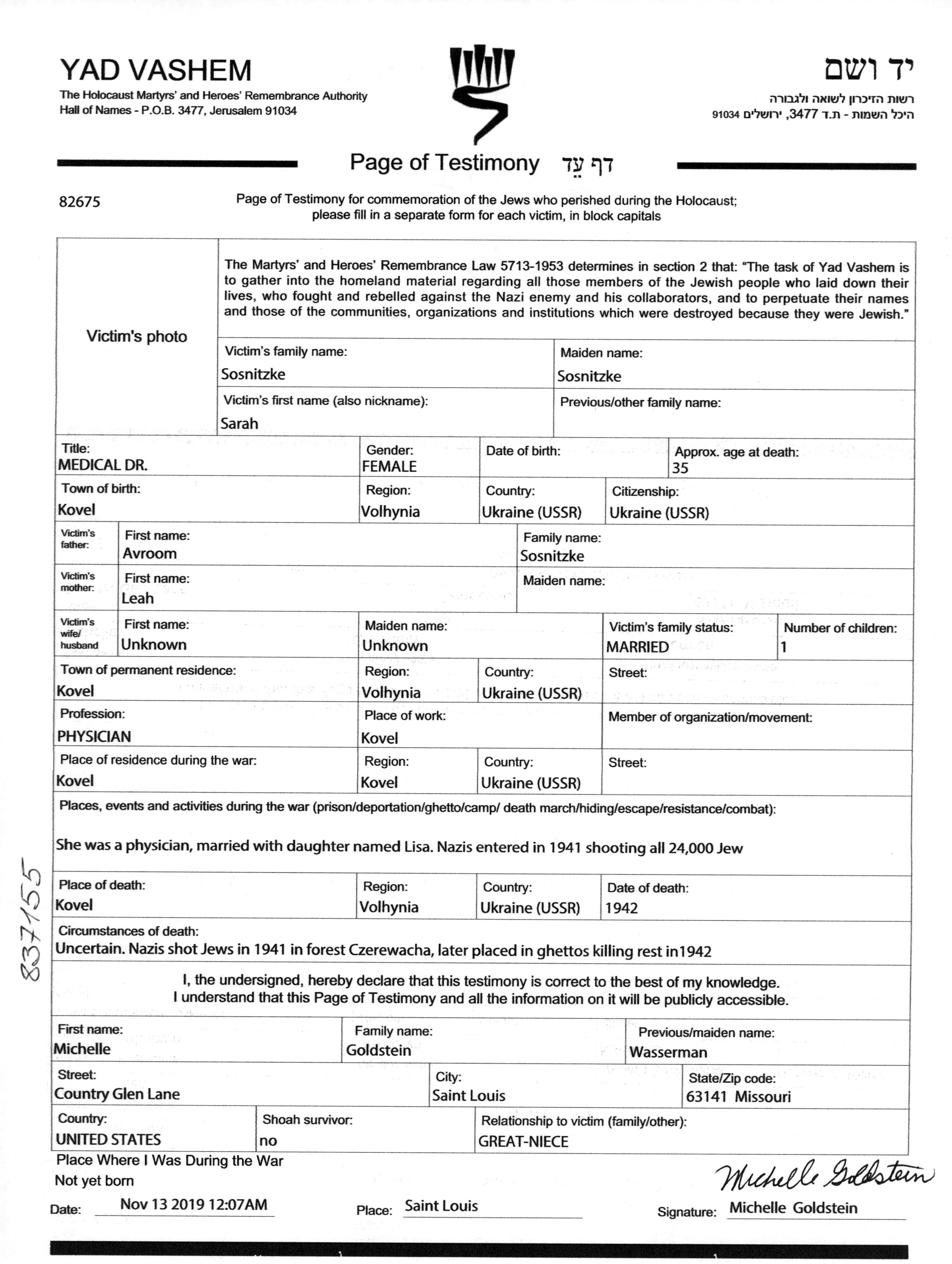 דר. לרפואה Sarah Sosnitzke נולדה בKovel שבפולין לAvroom וLeah. היא היתה רופאה ונשואה. לפני מלחמת העולם השניה התגוררה בKovel שבפולין. בזמן המלחמה היא היתה בKovel שבפולין.
