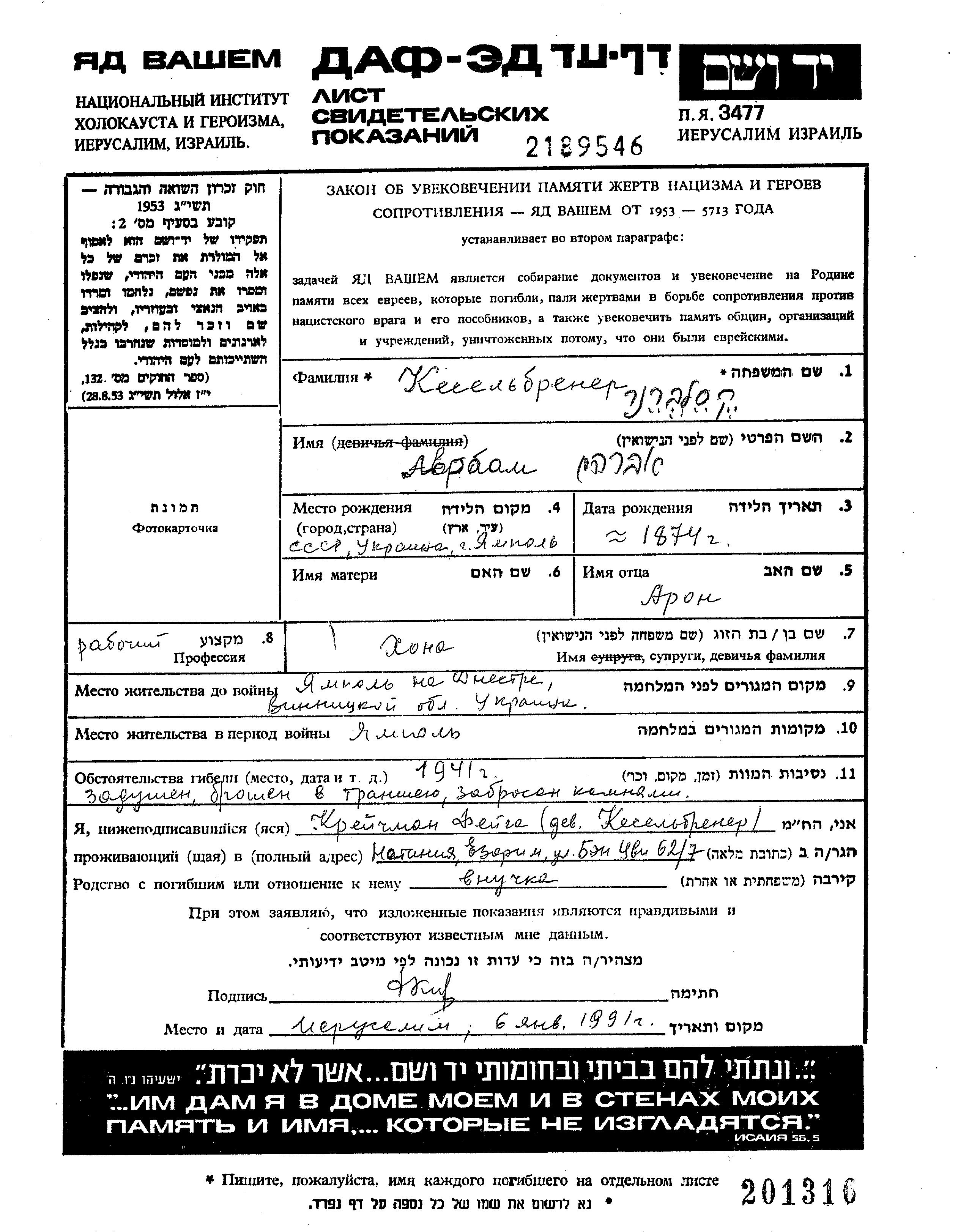 אברהם נרצח בשואה. מקום המוות: Yampol שבאוקראינה (ברה"מ) בשנת 1941.