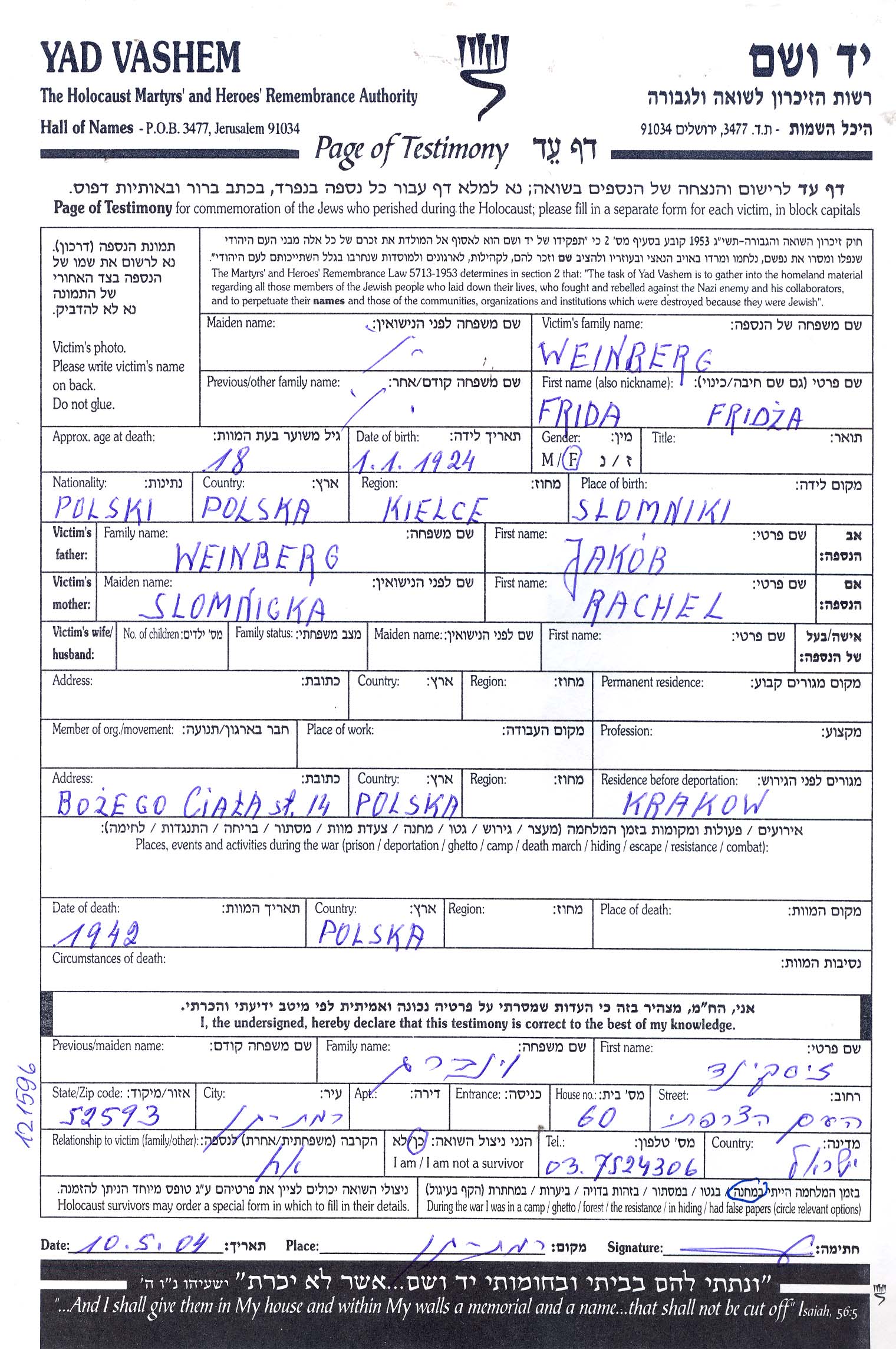 פרידה Weinberg נולדה בSlomniki שבפולין בשנת 1924. לפני מלחמת העולם השניה התגוררה בKrakow שבפולין.
