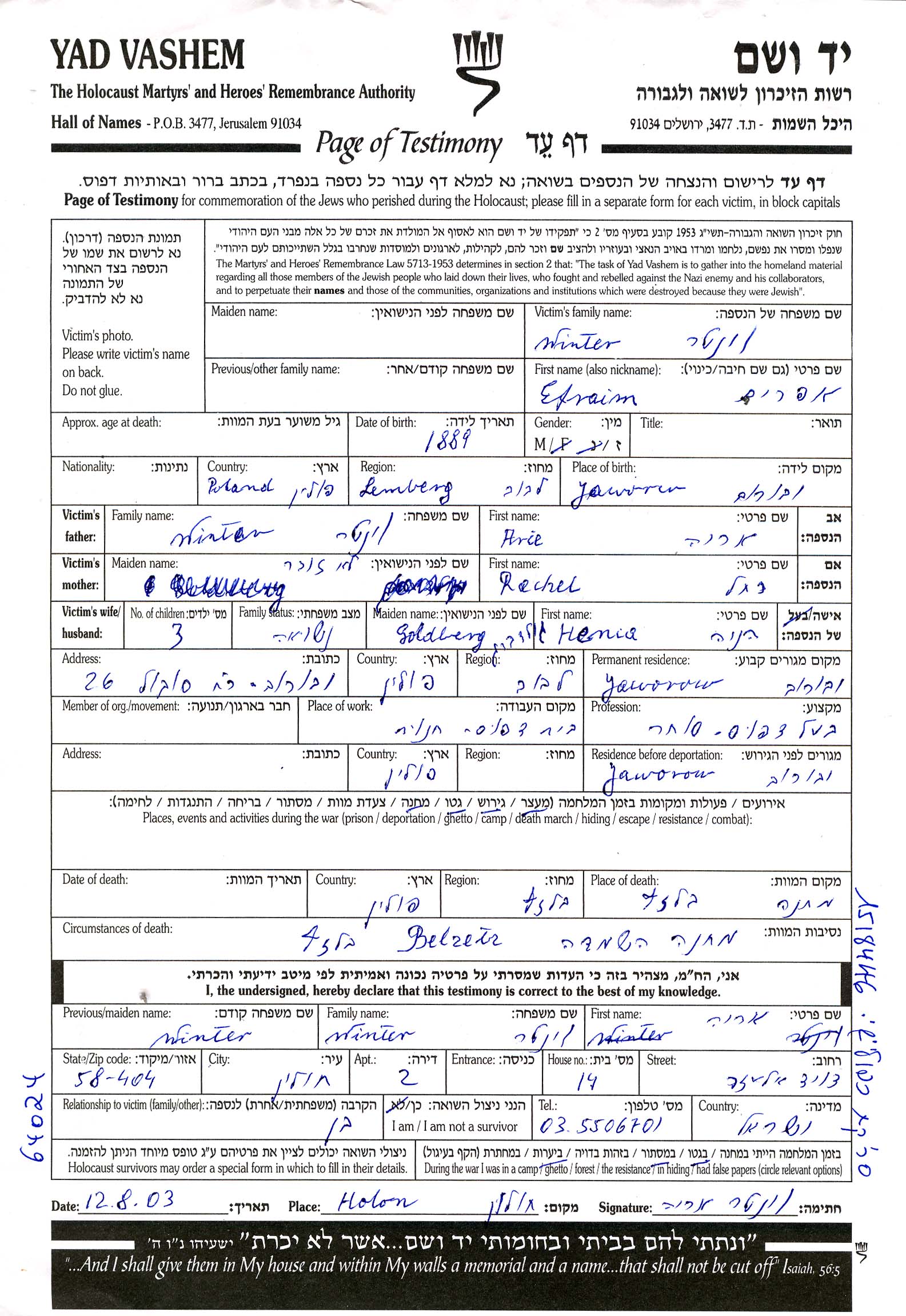 אפרים Winter נולד בJaworow שבפולין בשנת 1889. הוא היה בעל בית דפוס. לפני מלחמת העולם השניה התגורר בJaworow שבפולין.