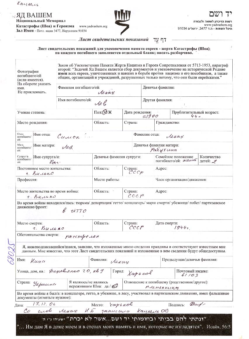 Lowa לוי Lekahc נולד בDzisna שבפולין בשנת 1905. הוא היה חשמלאי. לפני מלחמת העולם השניה התגורר בWilno שבפולין.